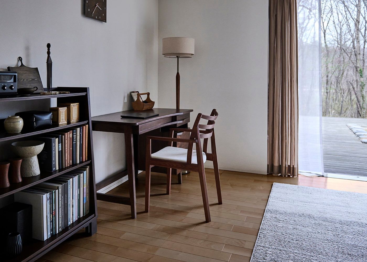 ハーモシリーズと組み合わせて統一感のある空間に仕上げました。プライベートな空間ならではの、リラックス感のある家具に囲まれた心落ち着く書斎をつくってみては。