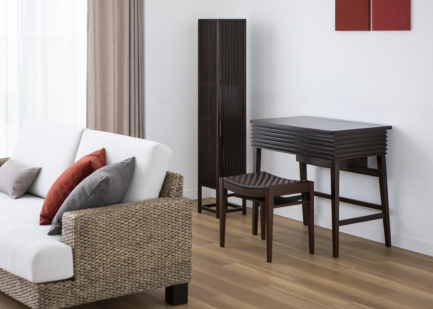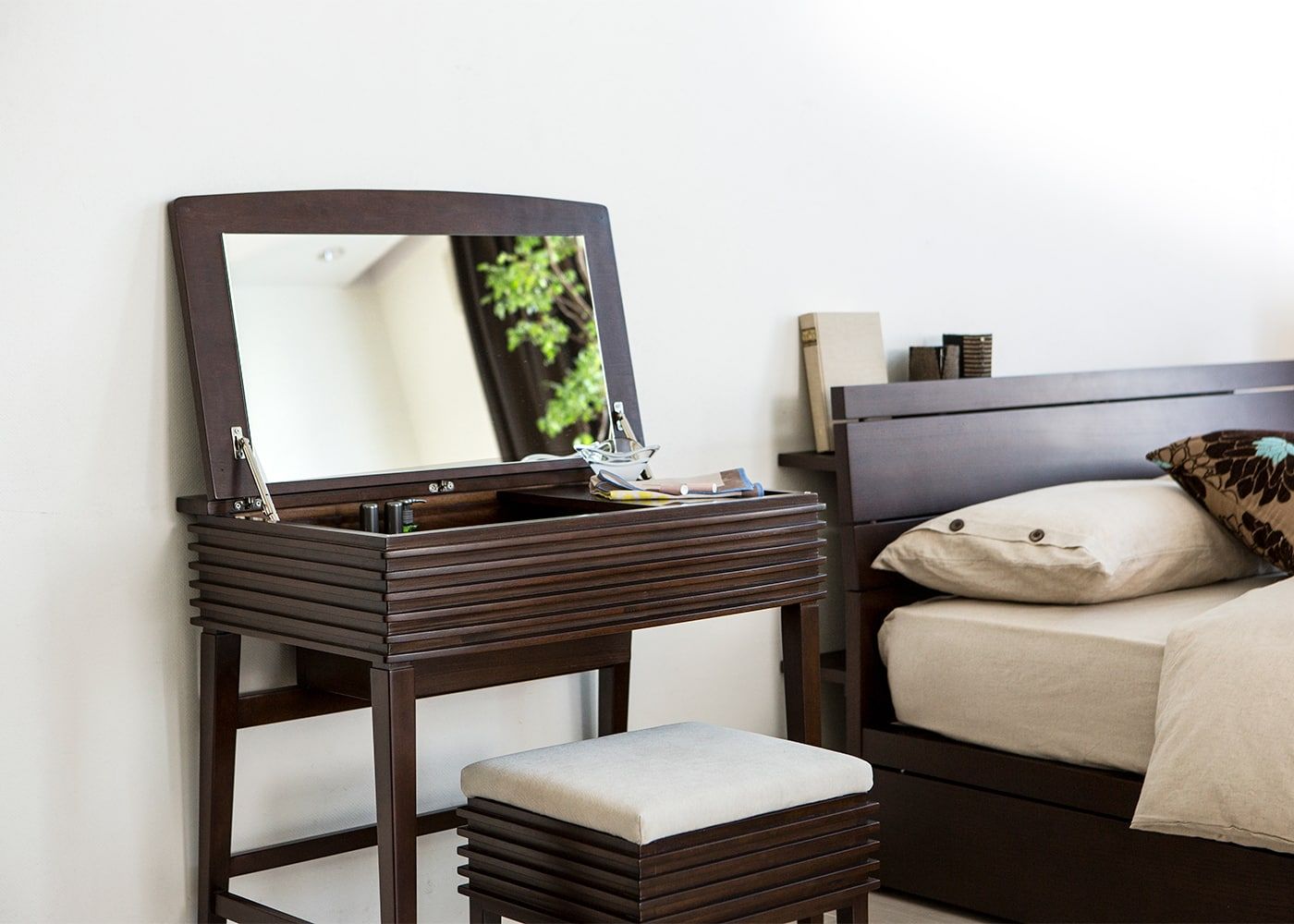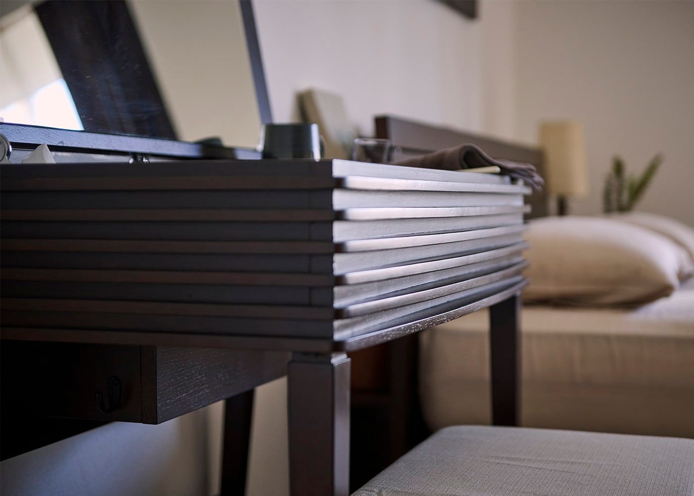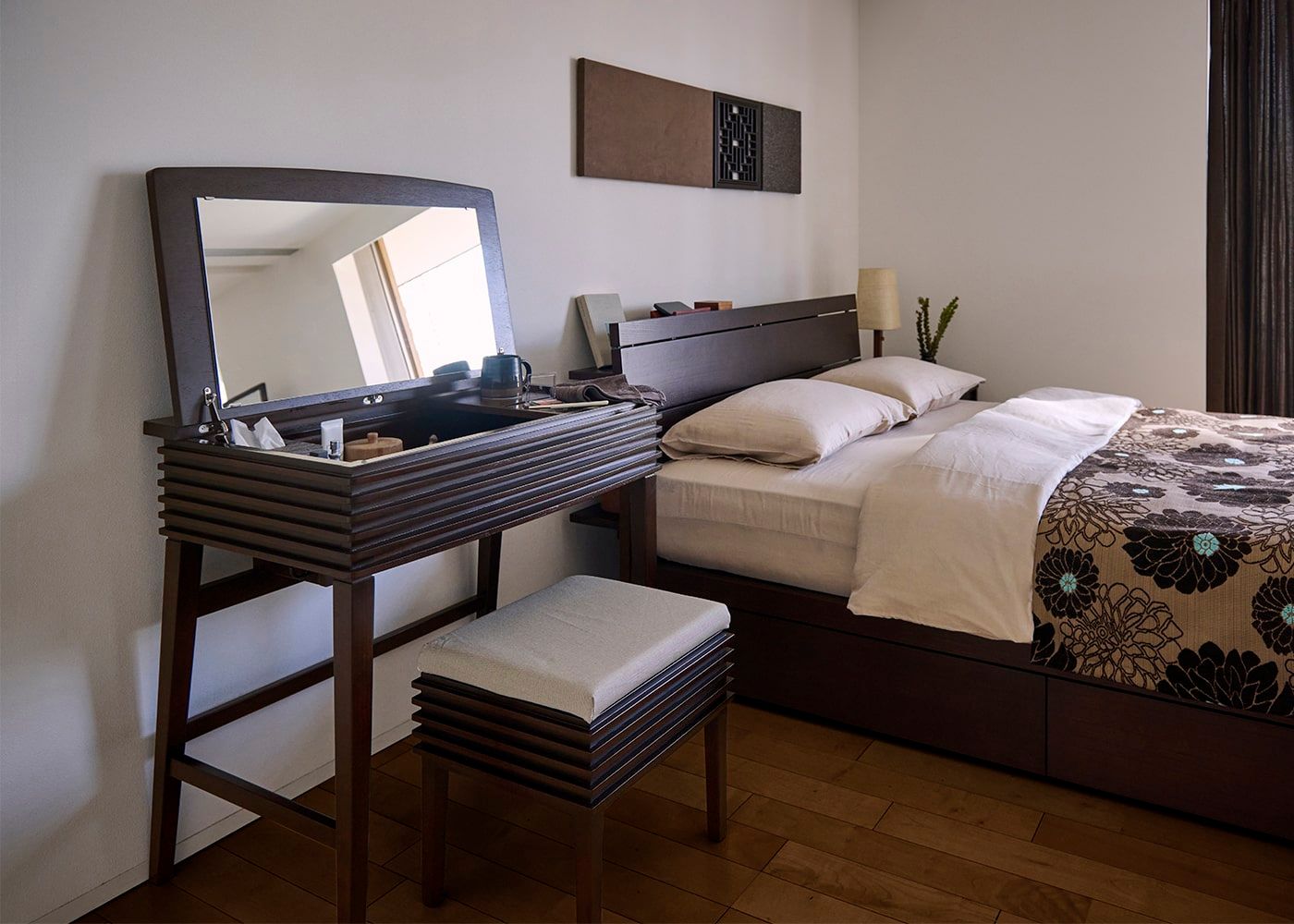 きめ細かなルーバーデザインが寝室にモダンなアクセントを与えてくれます。光が差し込むことで陰影が生まれ、雰囲気のあるスペースの中でお化粧を楽しめるでしょう。(写真は