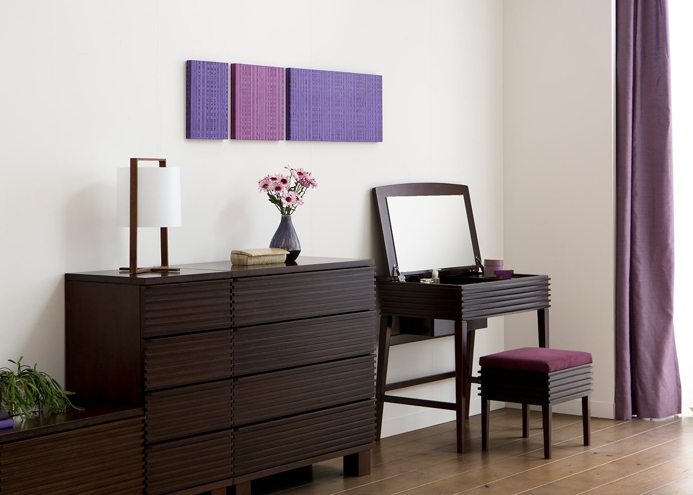 キャビネットセットと並べるだけで、風が通り抜けるような気持ち良い印象に。たくさんの衣類収納と大きな鏡のドレッサーのあるベッドルームでゆったりと身支度の時間を過ごしてみては。≫ルーバーシリーズ特集のフラワーパープルコーディネートは