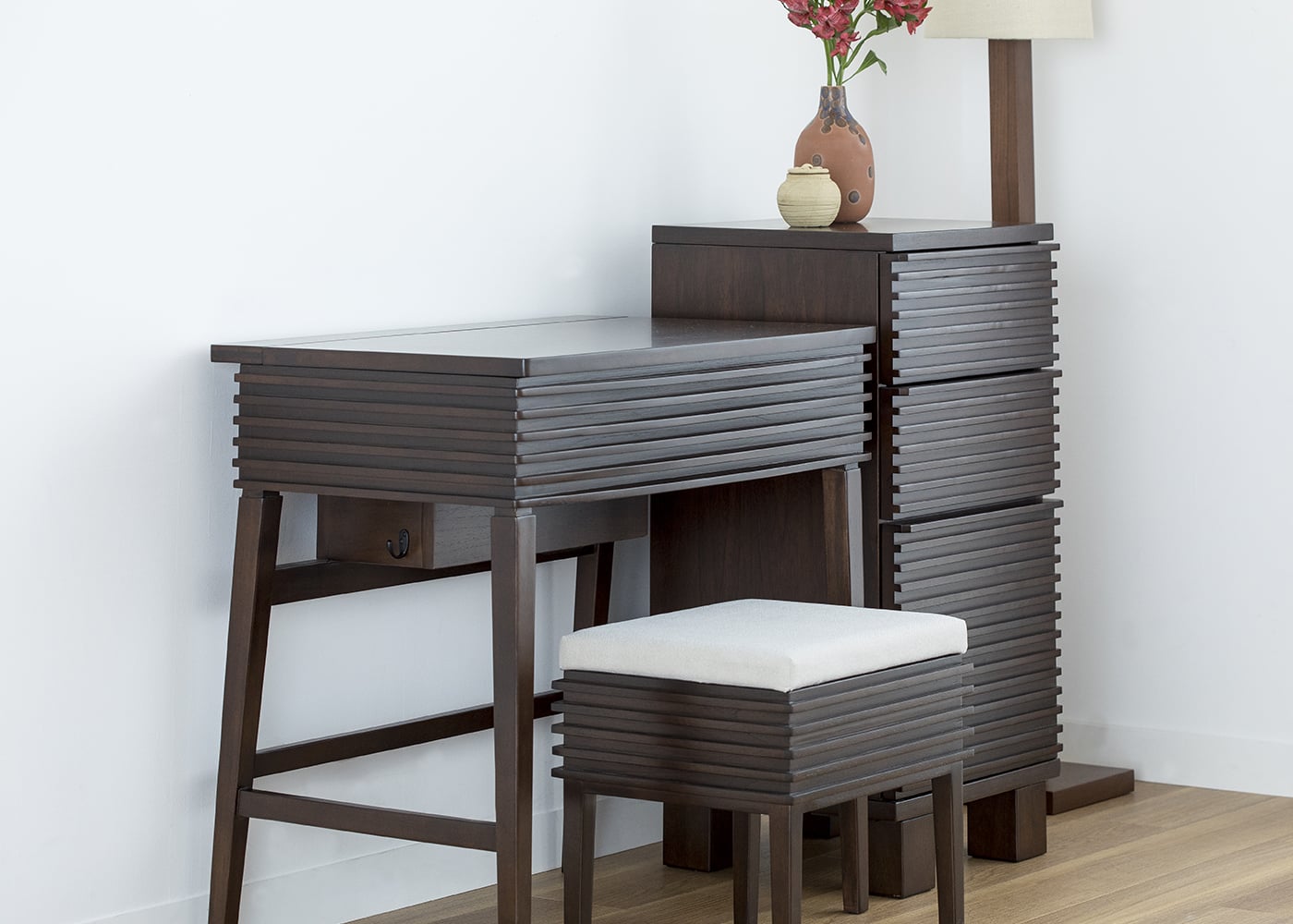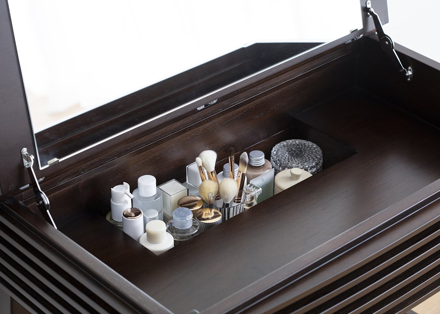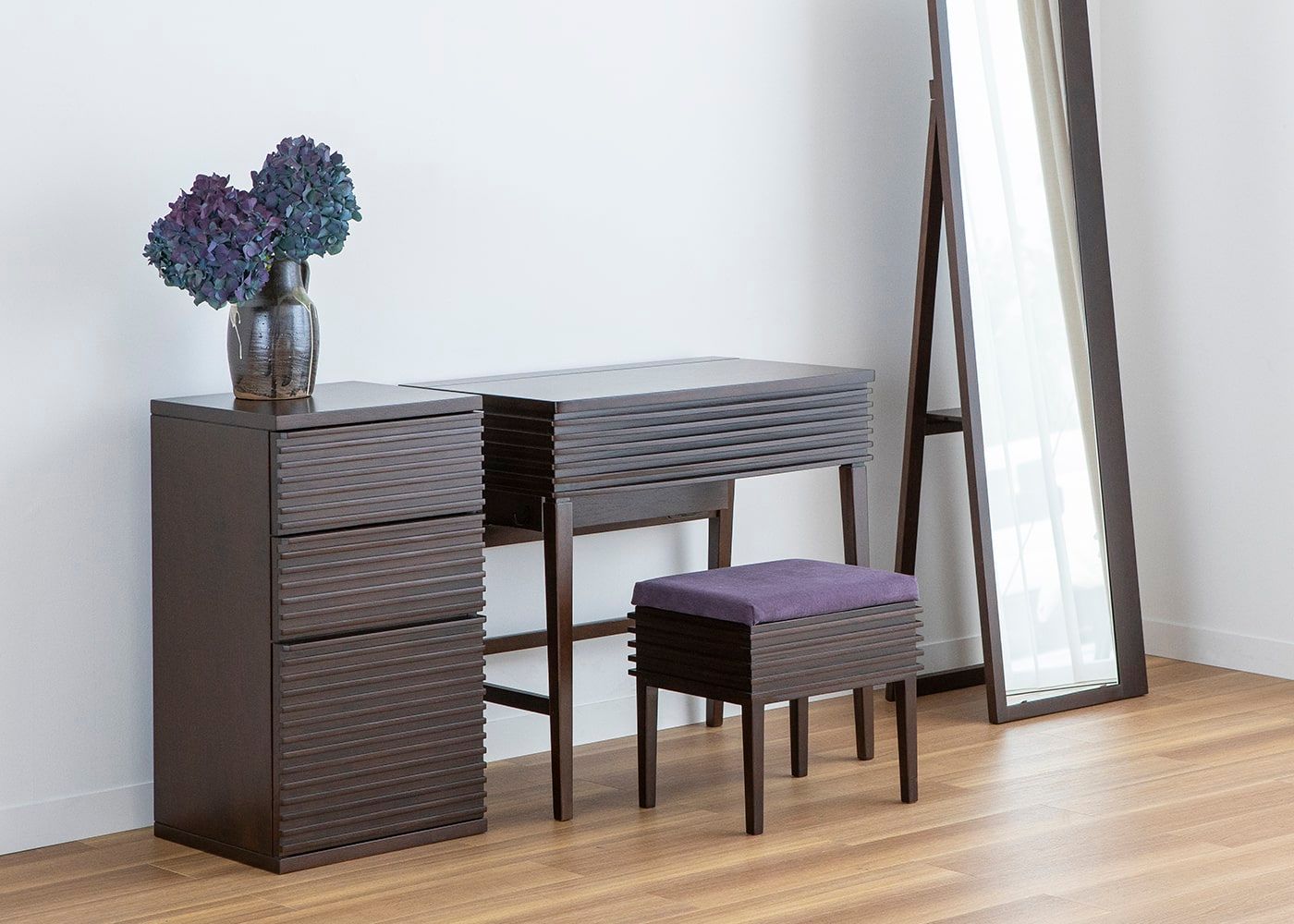 コンパクトサイズのドレッサーに使いやすさを追求した収納力や機能性を凝縮しました。ドレッサーのルーバーデザインに合わせた、