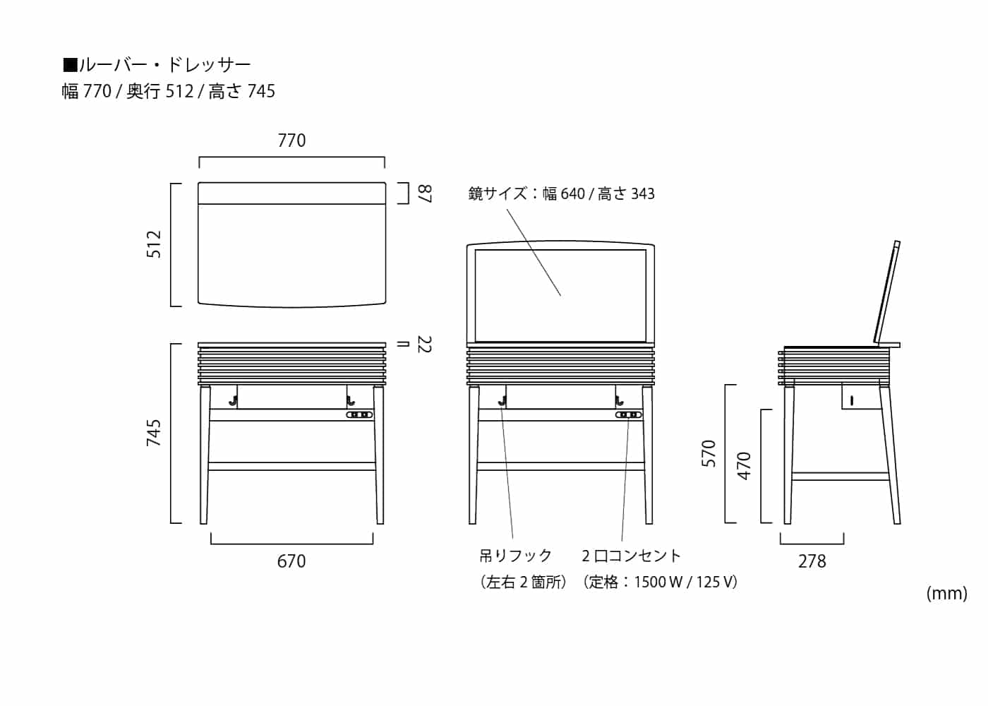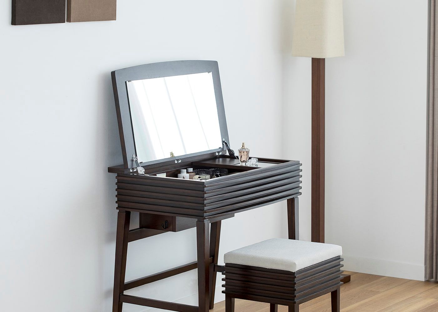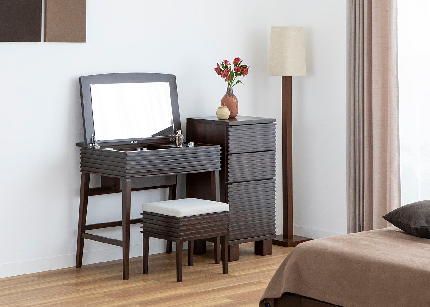 コンパクトサイズのドレッサーに使いやすさを追求した収納力や機能性を凝縮しました。ドレッサーのルーバーデザインに合わせた、