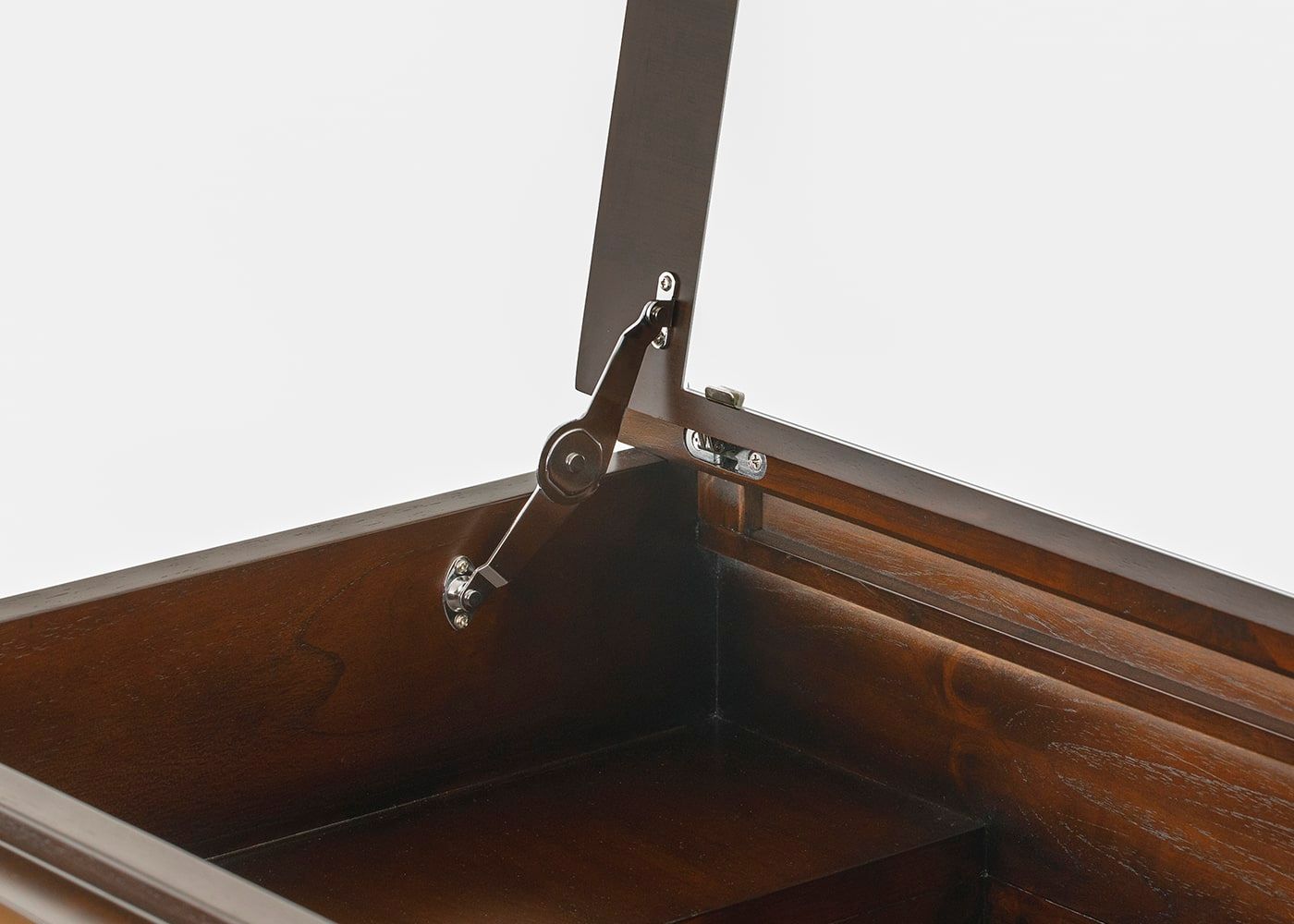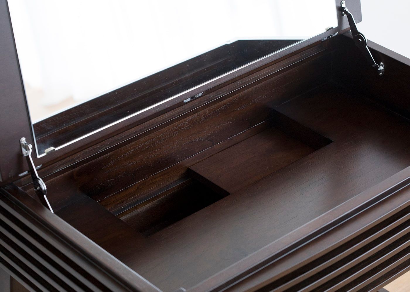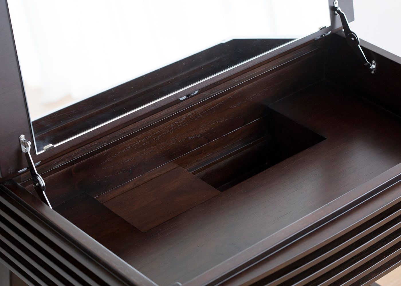 女性の力でも鏡がスムーズに開閉可能な金具を天板の両側に取り付けています。突然のゆれで閉まらないよう、ロック機能も付いており、安心安全なドレッサーです。