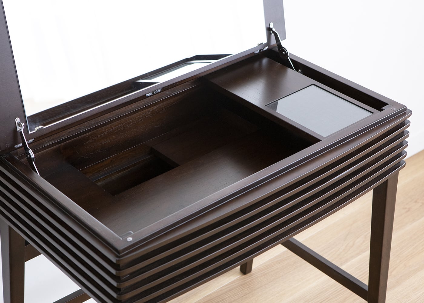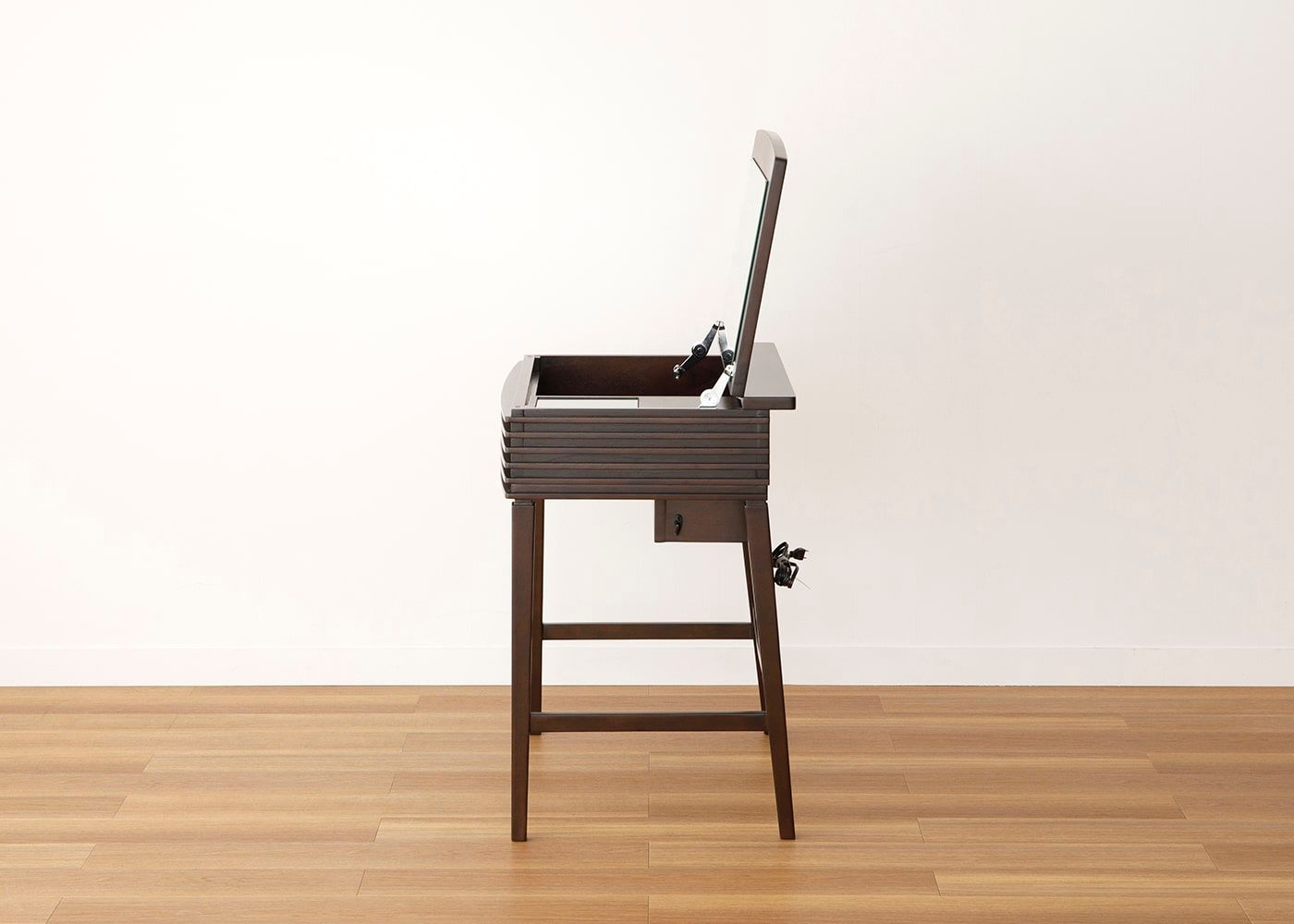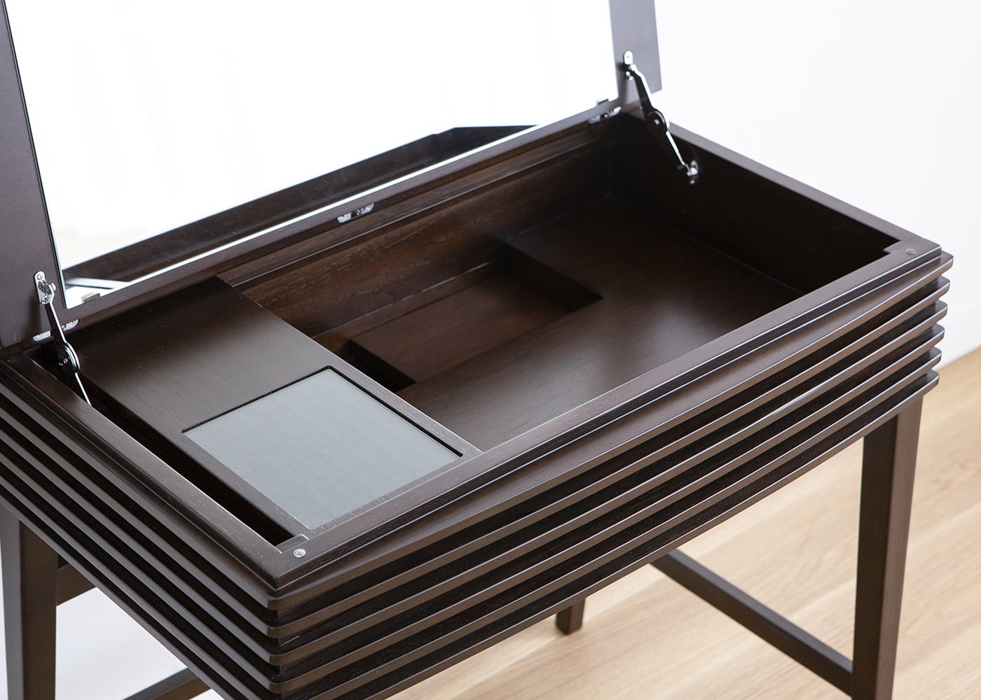 鏡を使わない時は天板を閉じて隠しておくことができ、リビングルームがすっきりとします。天板を閉じれば簡易デスクとしても活用できる1台2役の機能性抜群のドレッサーです。