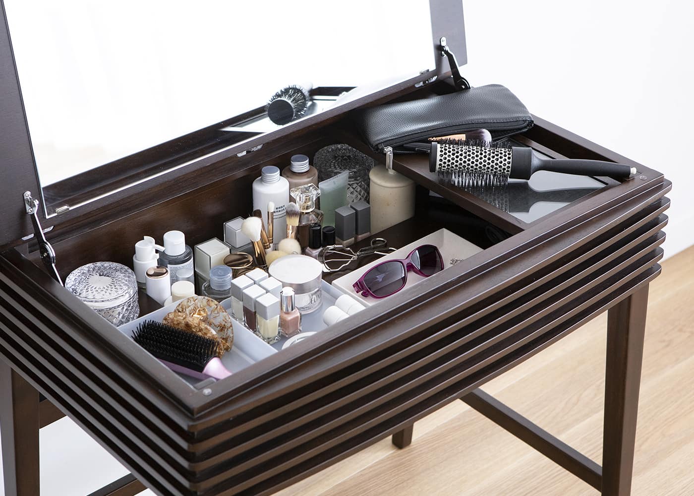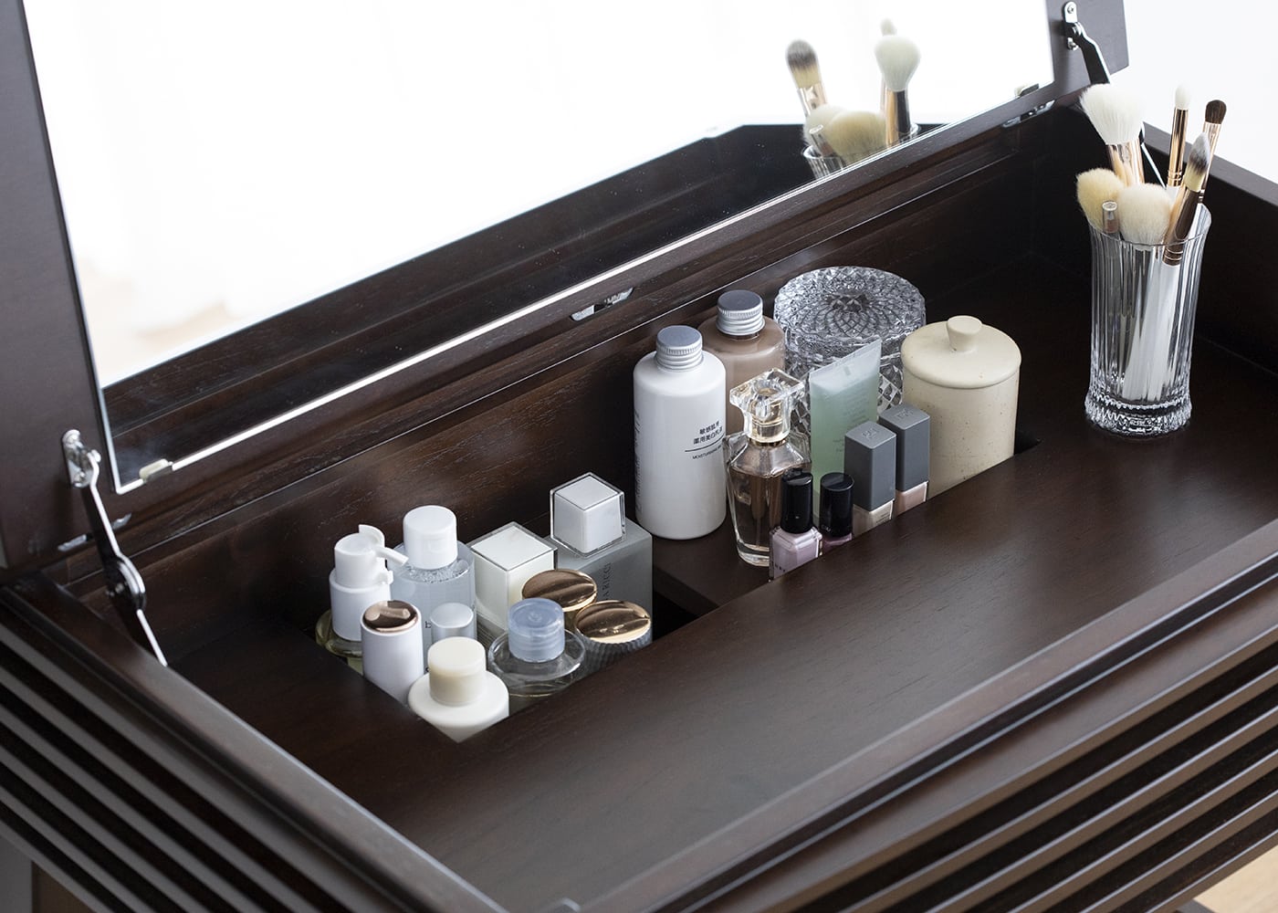 化粧品やマニキュア、ヘアブラシまで、ありとあらゆるものがこのドレッサーに収納できます。