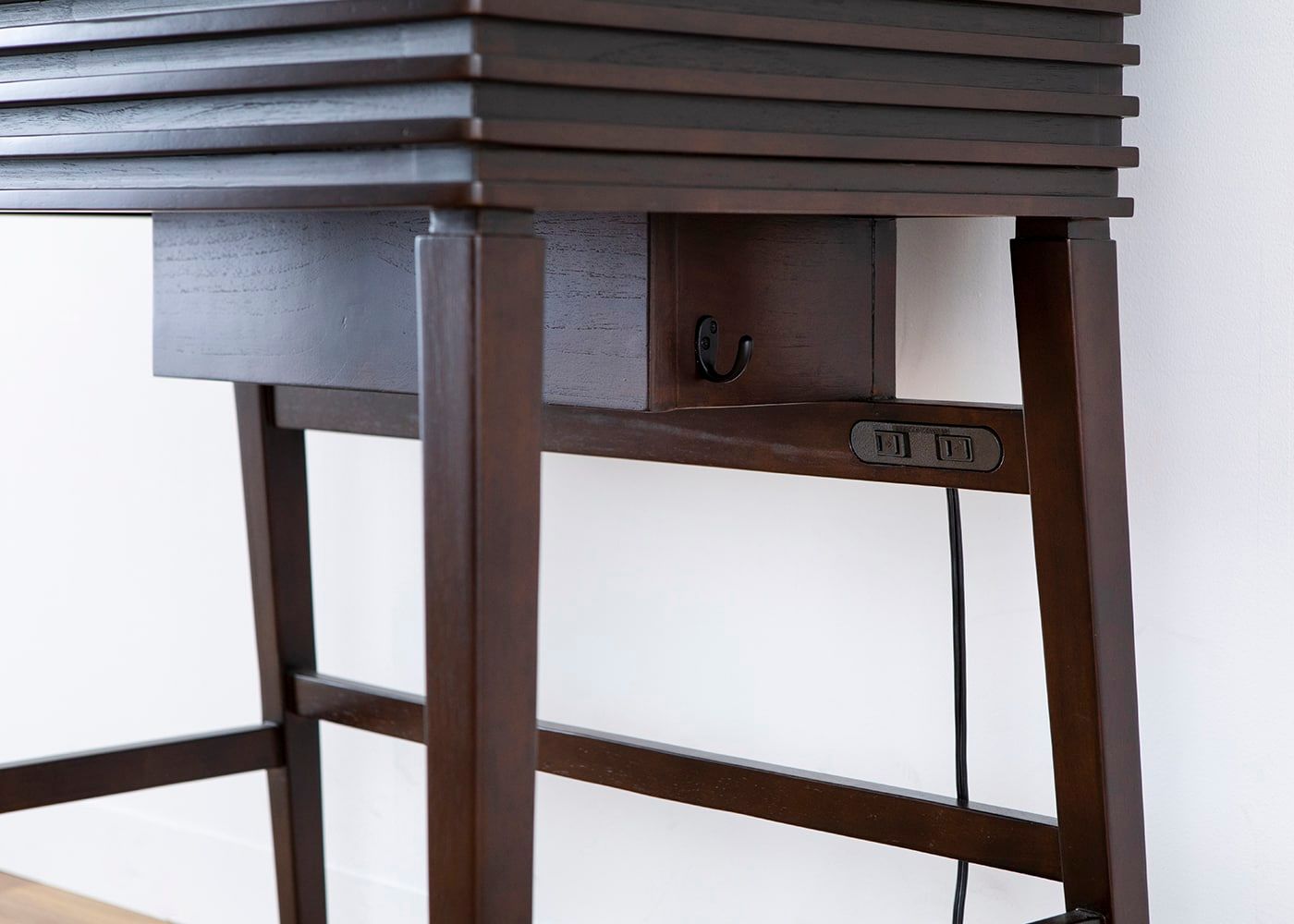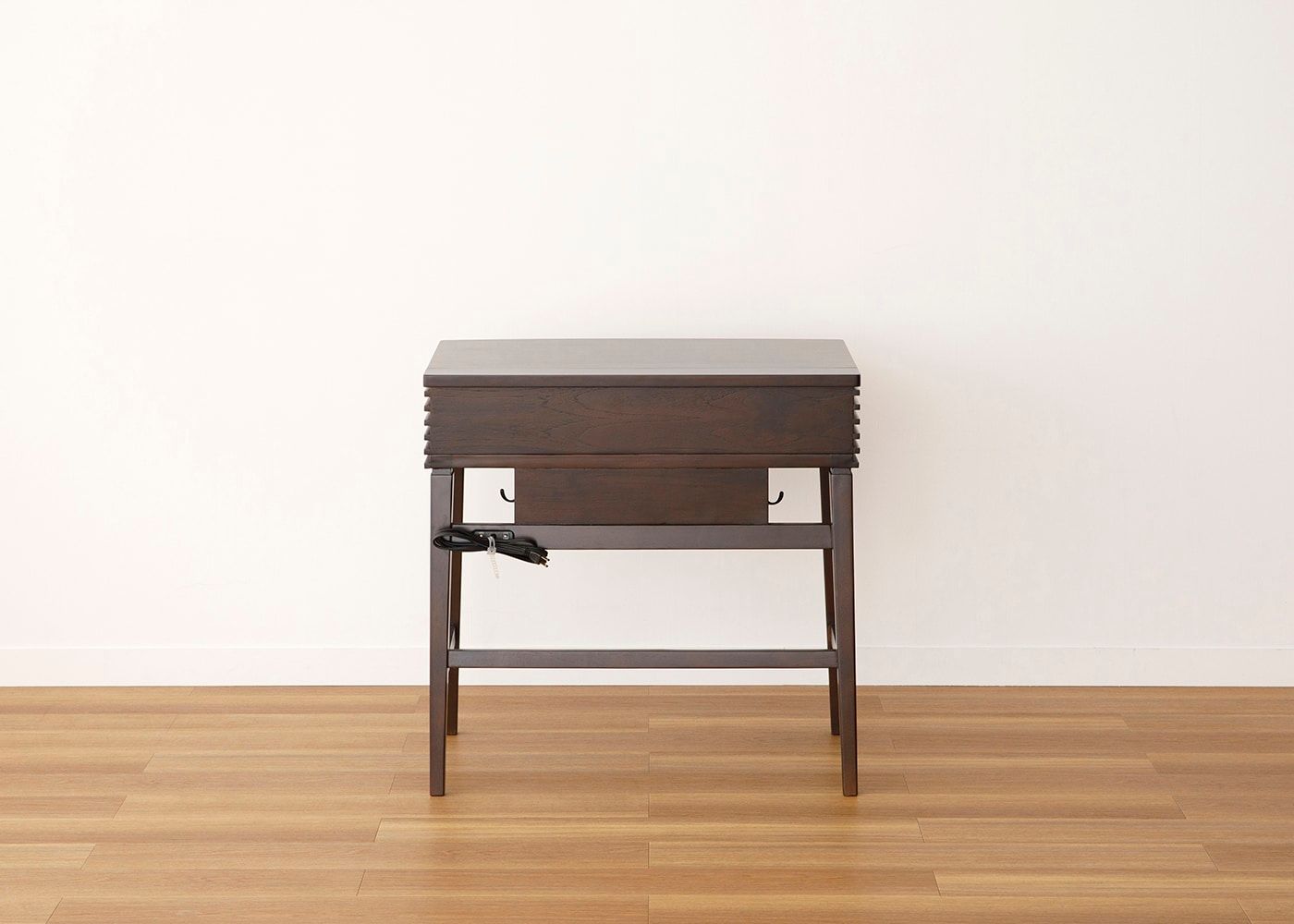 天板下には2口コンセントと吊りフックが付いています。ドライヤーやヘアアイロンをコンセントに挿して使用して、使用後はそのままフックに掛けて収納できる使い易い設計です。デスク使いの際はノートパソコンなど電源としても使えます。(2口コンセントは右側1個、吊りフックは左右各1個付属)