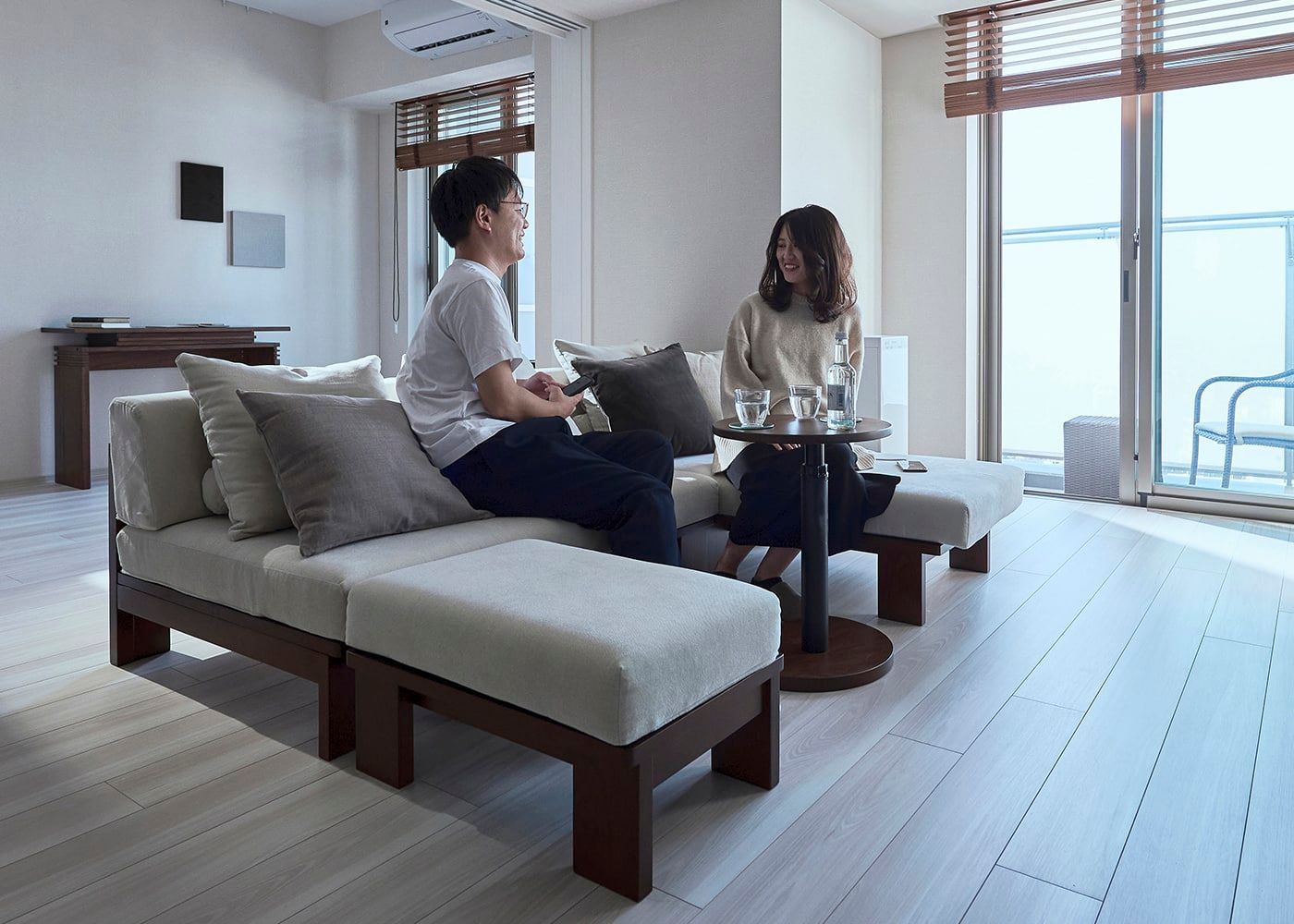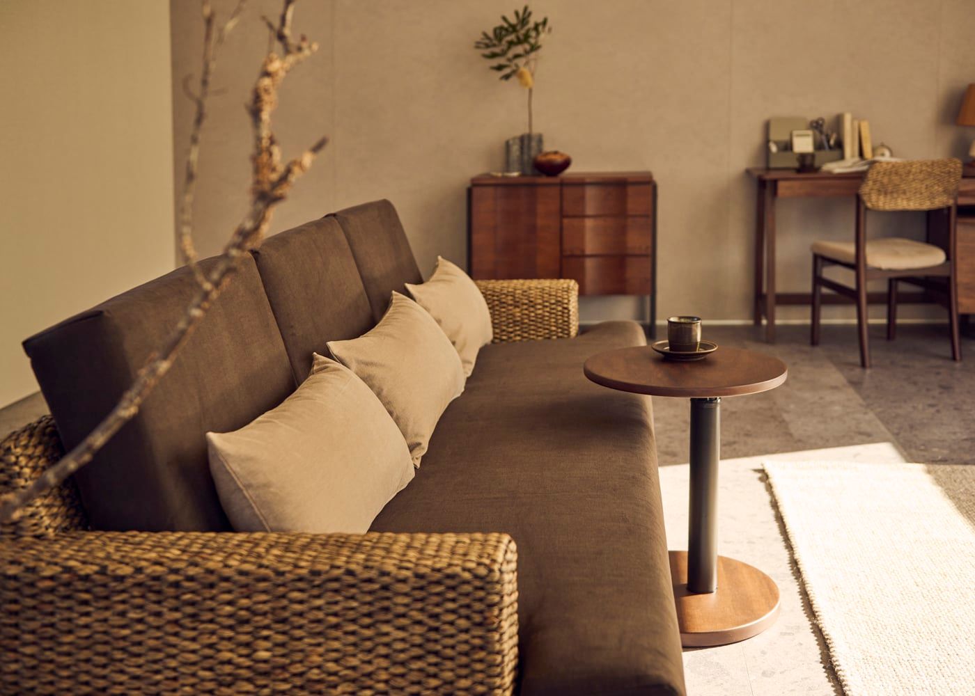 ロースタイルとブラウンのコーディネートを取り入れた二人暮らし実例。サイドテーブルとロースタイルの家具で空間を広く見せ、シンプルなコーディネートが心地よい環境を生み出します。