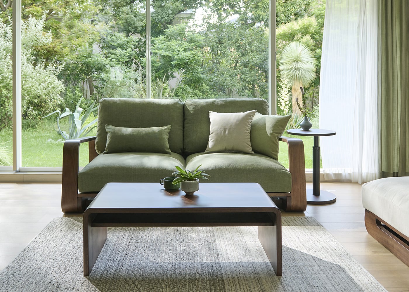 ハーブグリーンの無垢材ソファとサイドテーブル。ローテーブルでまとめたリビング実例。ハイバックタイプのソファに座って、穏やかな空気感に包まれながら家族の時間を楽しめます。