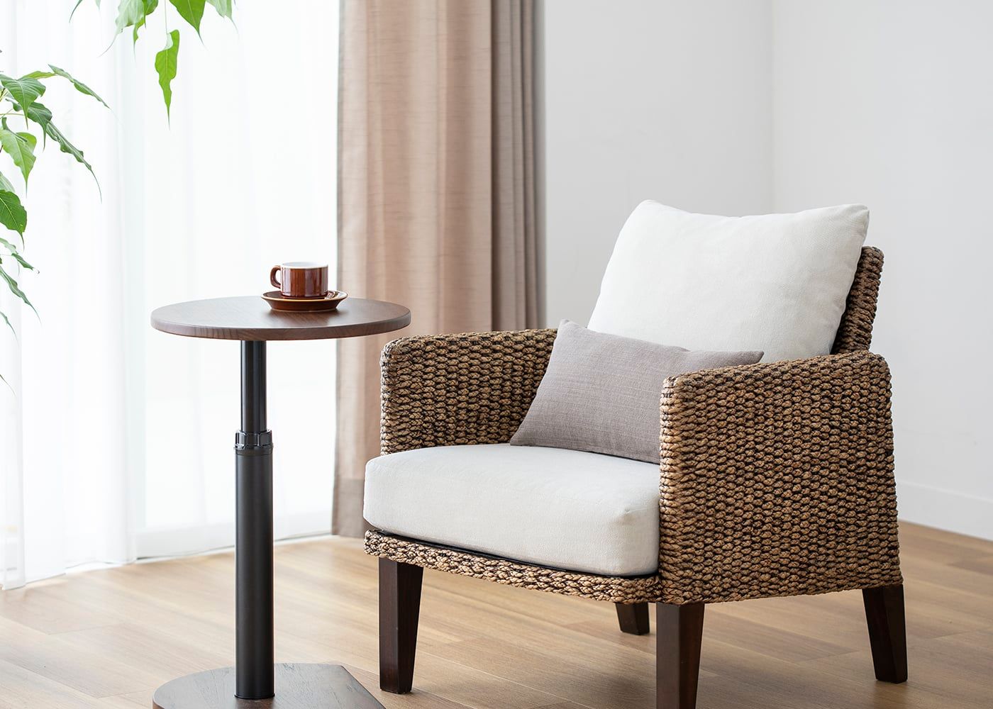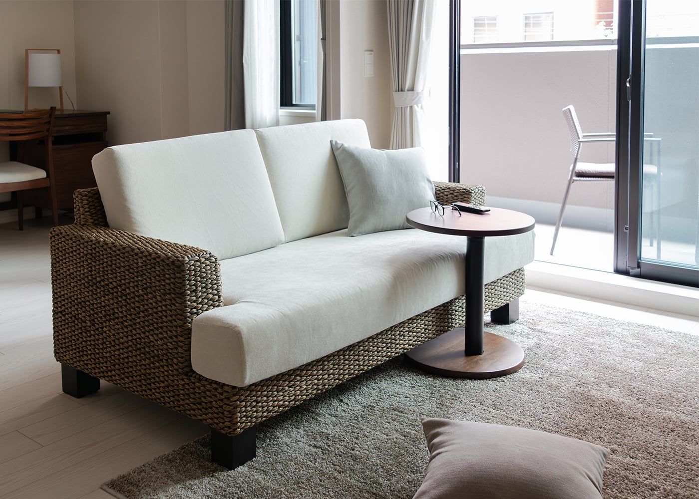 都会の景観に合うシンプルなリゾートホテルのような空間を実現したお客様実例。無垢材サイドテーブルとも相性の良い編み込み素材のソファを取り入れたのがポイントです。