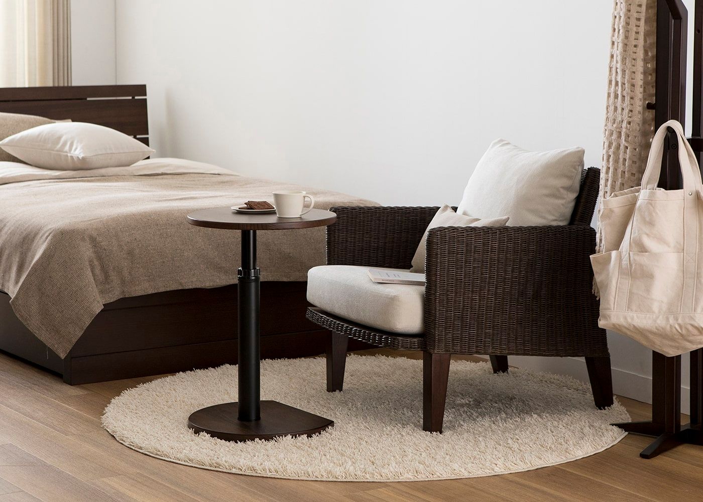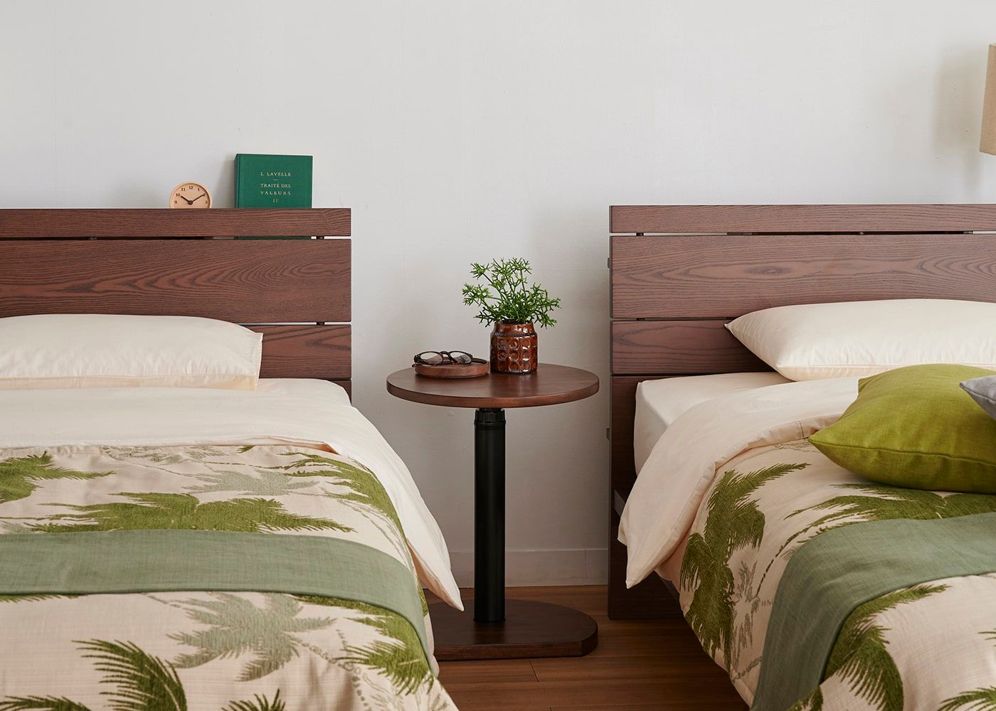 ベッド横のサイドテーブルとしても活用します。無垢材のベッドとも好相性で統一感のある寝室作りを楽しめるでしょう。(写真は