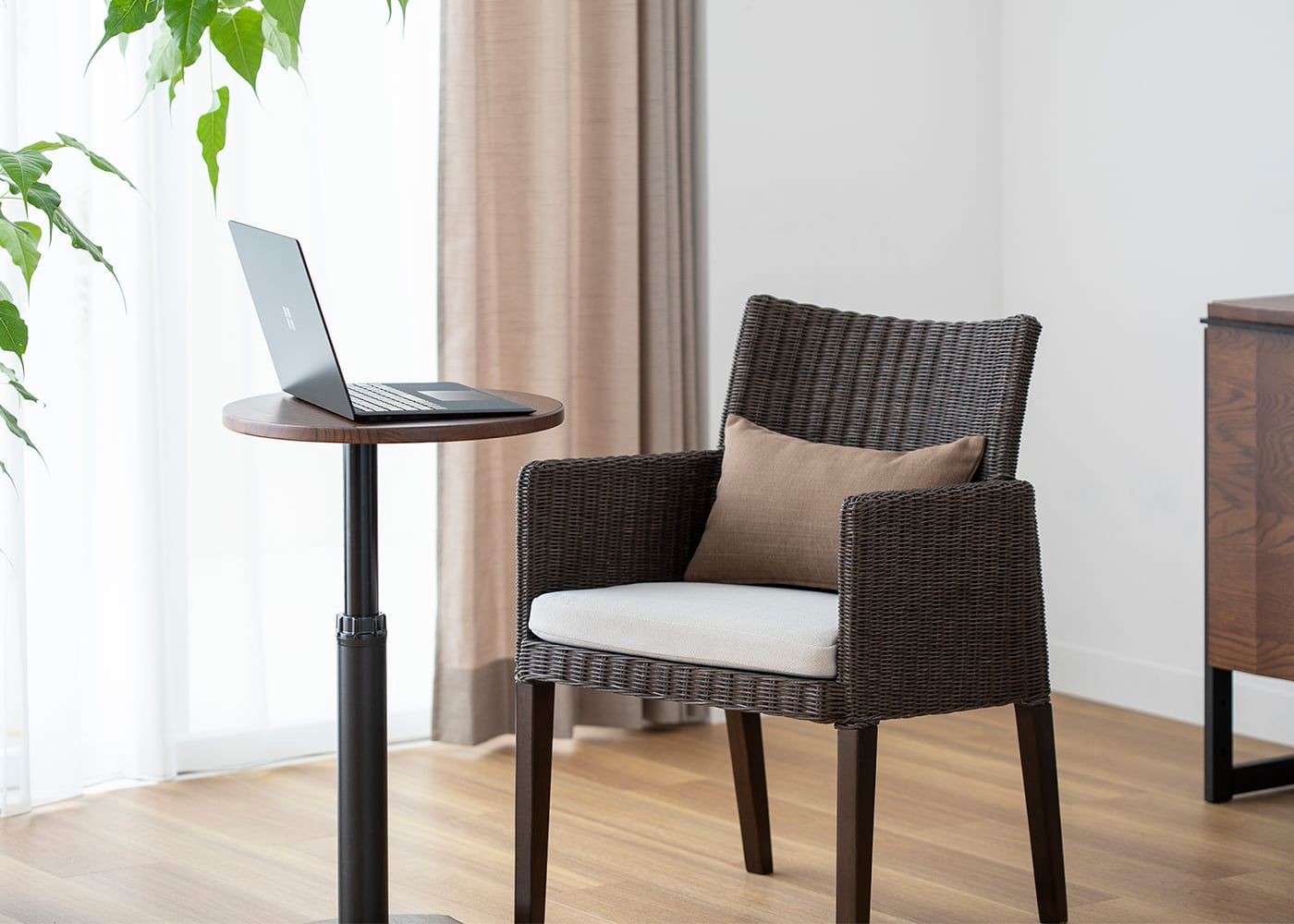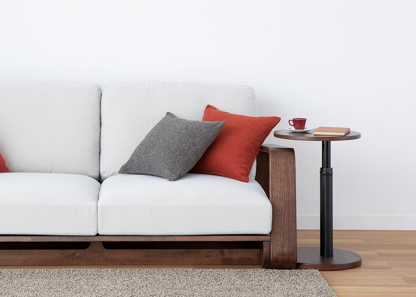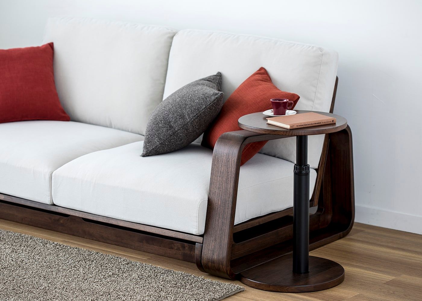 自分の使い易い天板高さに調節することで、ソファに座ったままノートパソコンやタブレットを楽しむことができます。スリムな一本脚のデザインによって、自分の脚を伸ばしながら快適に作業が可能です。(写真は
