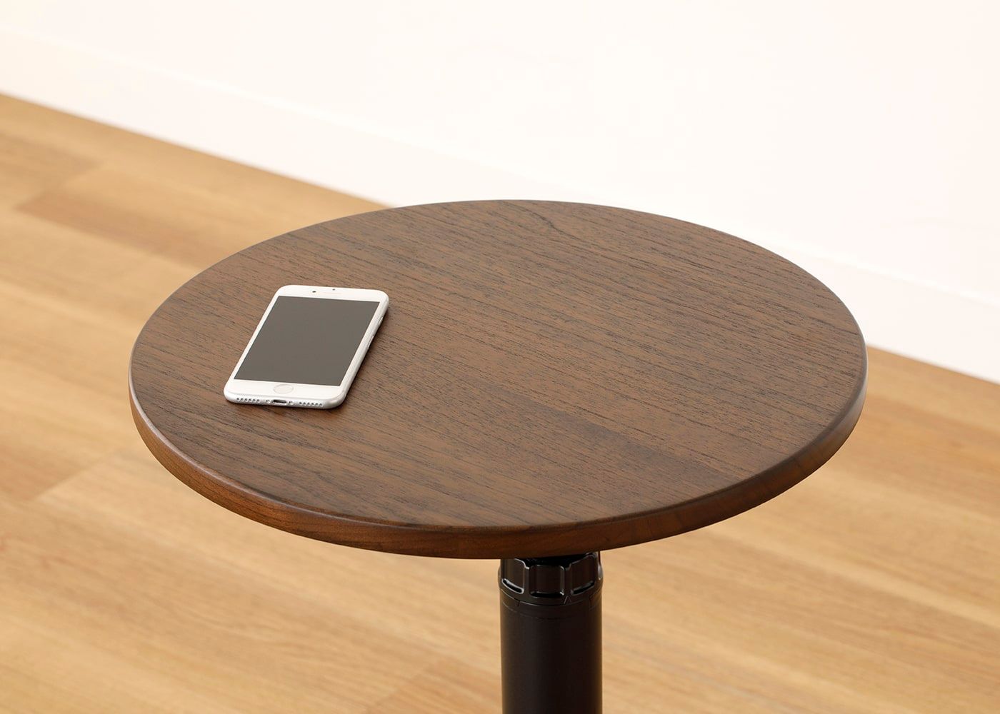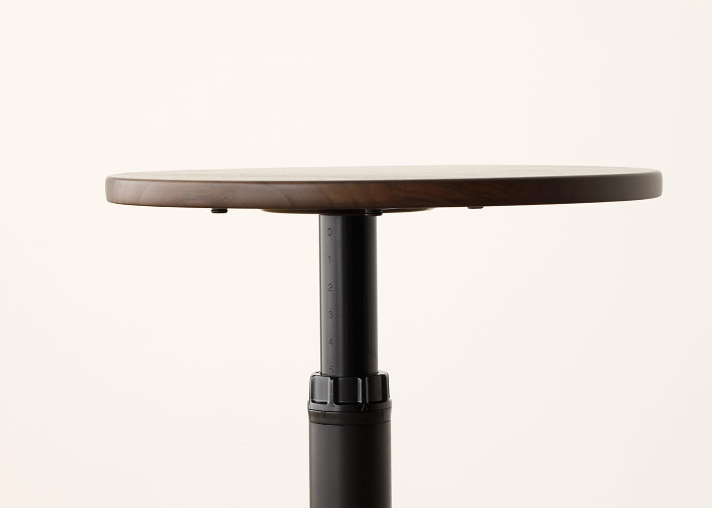 高さ調節のロックを解除した後に、台座を押さえながら天板を軽く持ち上げるだけで高さが変えられます。好きな高さでロックして高さ調節完了です。使う人の体形や体勢、場所に応じて高さをお選びください。