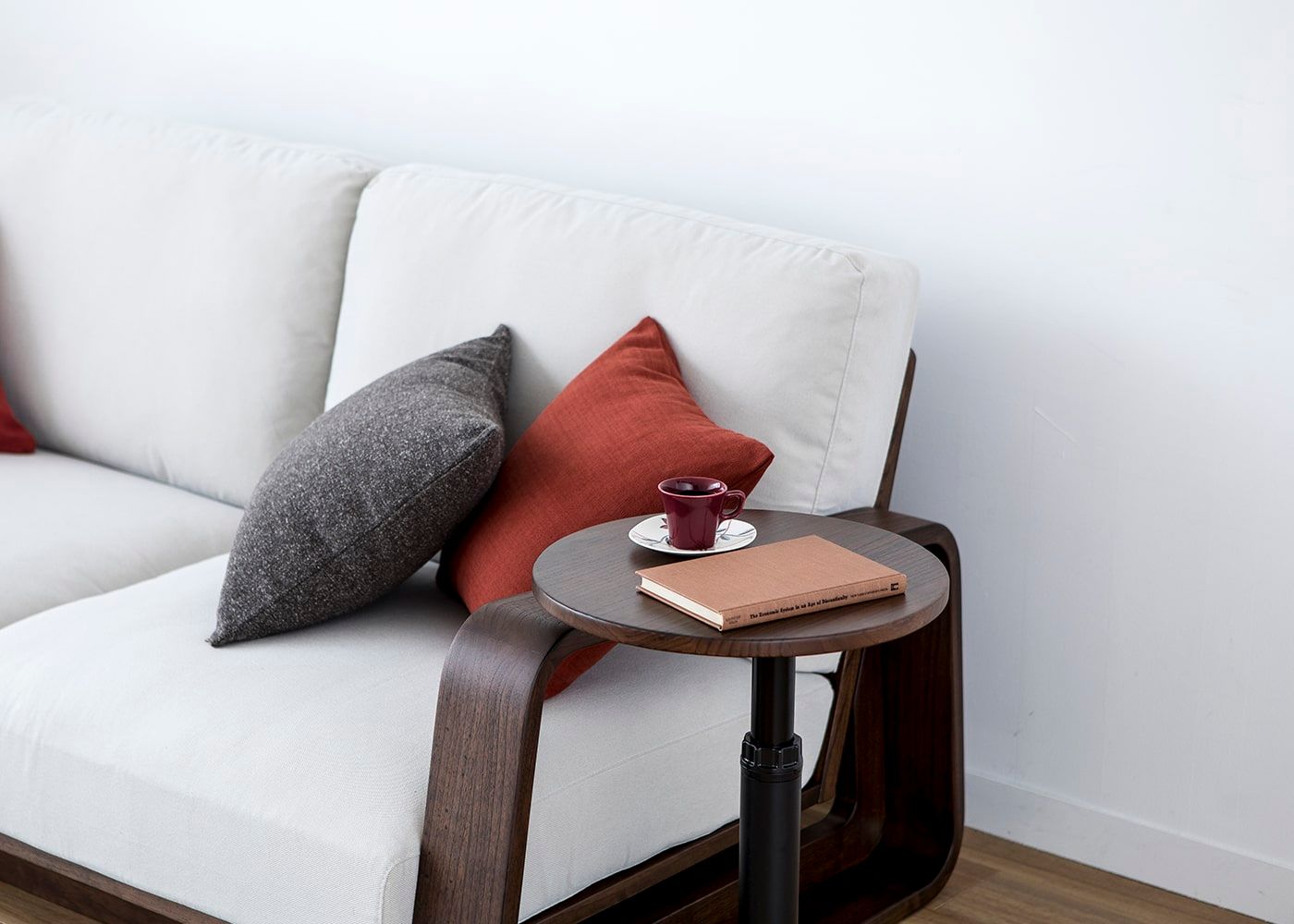 テン・シリーズのソファと合わせると、無垢材の温かみを感じるリビングルームに。コの字型のテーブルはソファのアームに差し込むことができます。天板がソファ近くなることでより使い易く、限られたスペースでも省スペースに使えるでしょう。