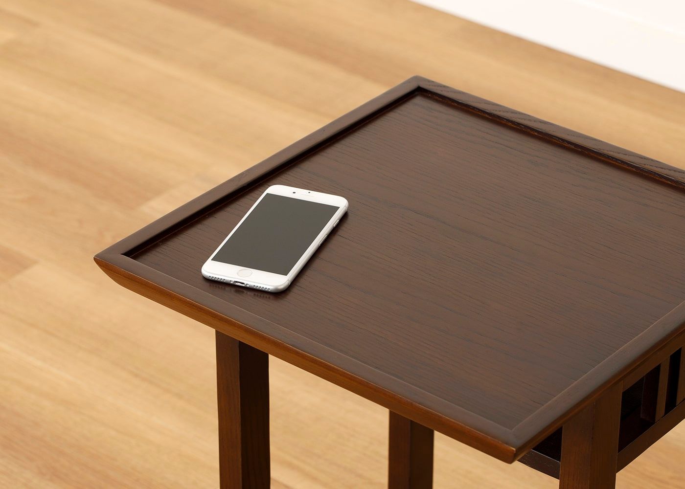 天板に縁を設けることで、スマホやコップなどの置いた物が落ちにくいよう、安全面に配慮したサイドテーブルです。
