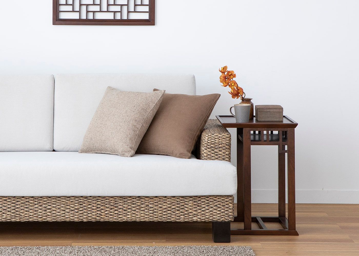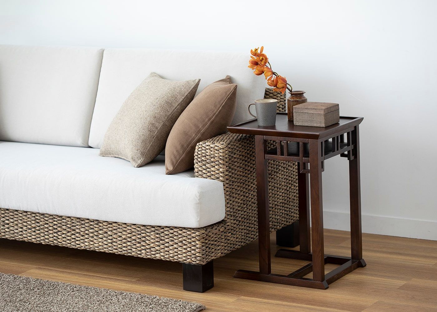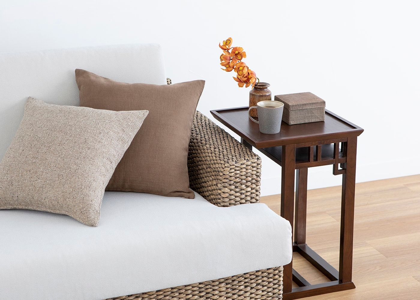 このサイドテーブルを置くだけで、リビングルームがオリエンタルな雰囲気に。コの字型のテーブルは