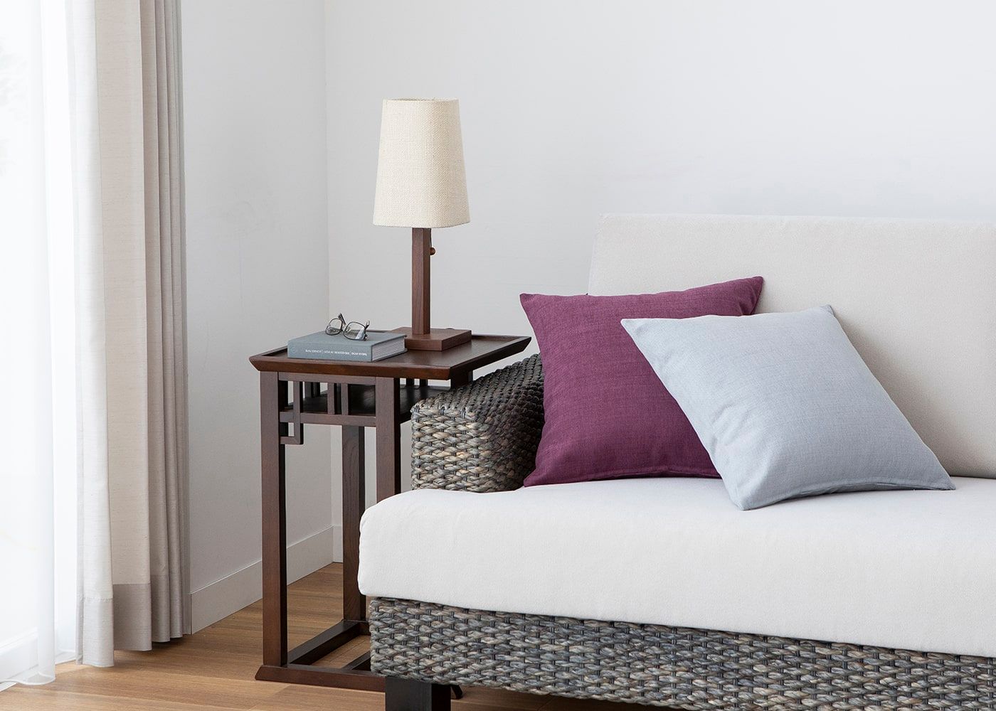 ベッド横のサイドテーブルとしても活用可能です。ライフスタイルに合わせて、リビングから寝室までマルチに活躍してくれます。(写真は