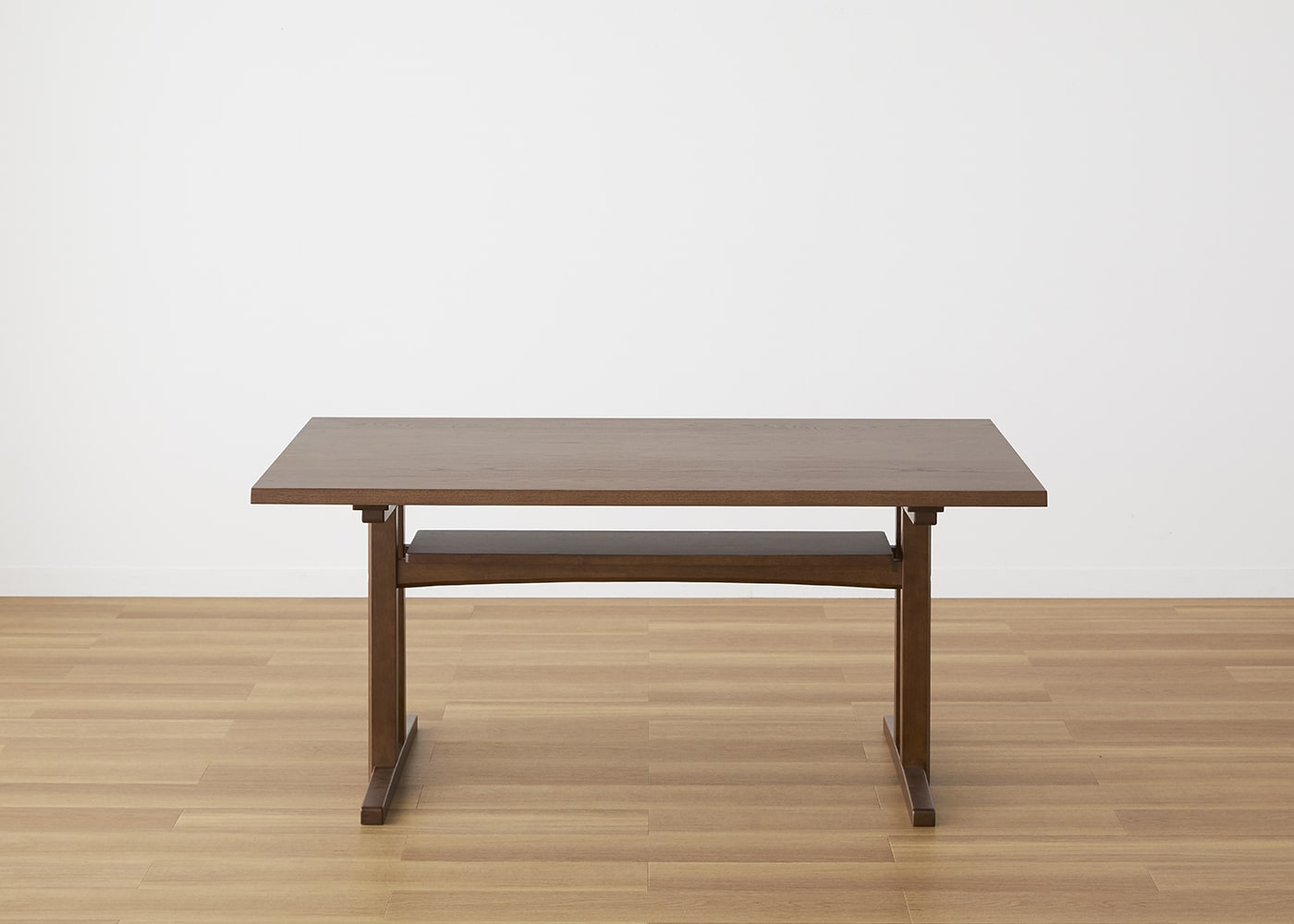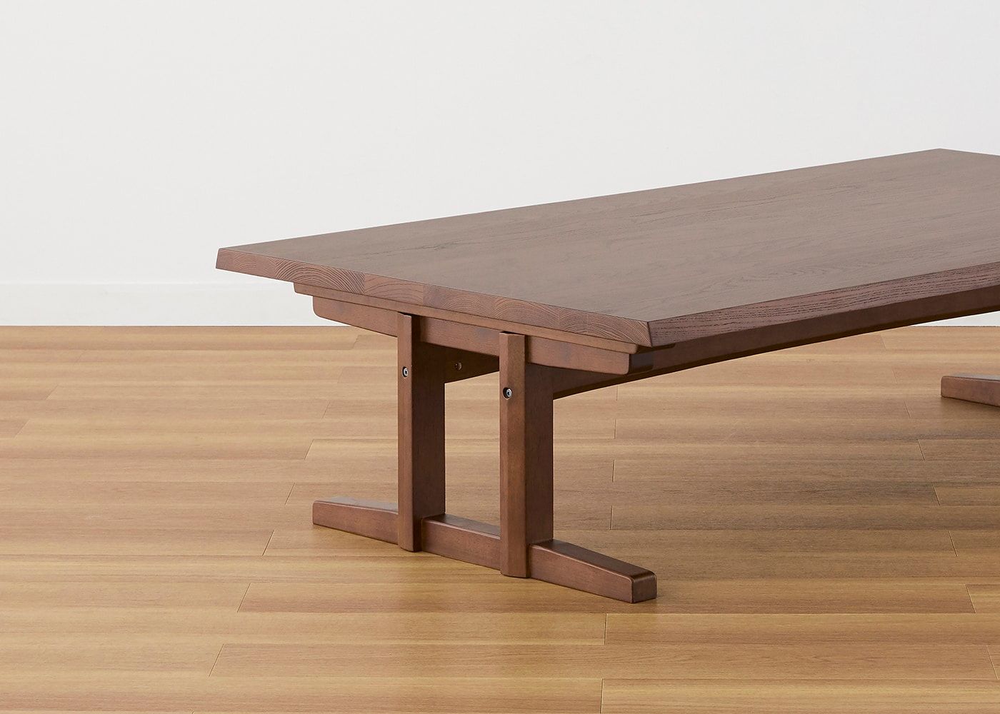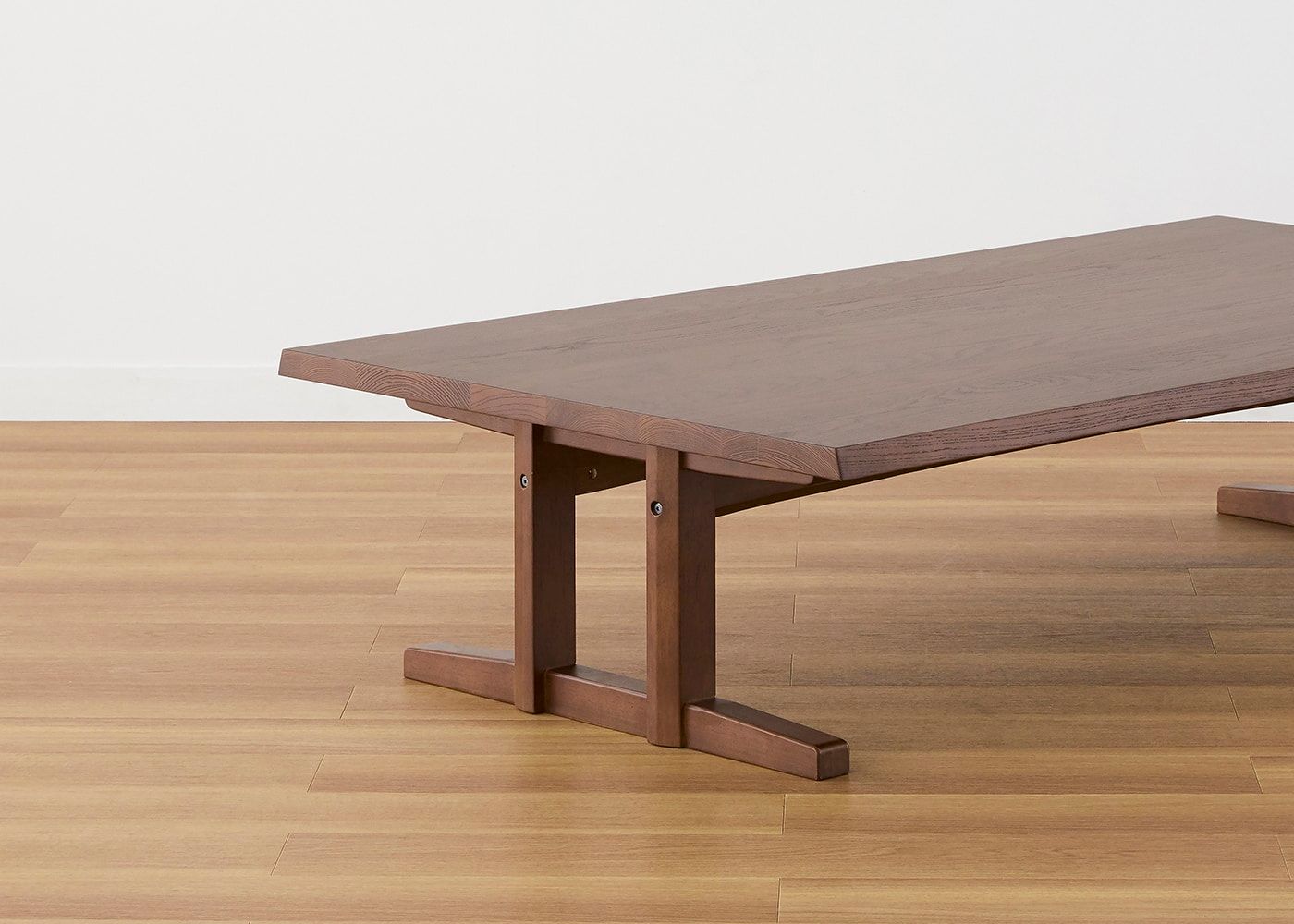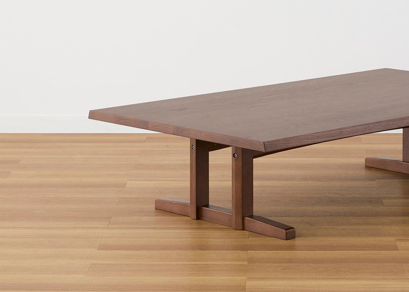 【組み替え例2】再度の引っ越しで間取りが変わり、ダイニングチェアで食事が楽しめるローダイニングにしたい時には、同梱されている「かさ上げ材」を天板と脚の間に取り付けると、天板高さ67cmのモク・ローダイニングテーブル 1500(GB)になります。(写真は脚内付け)