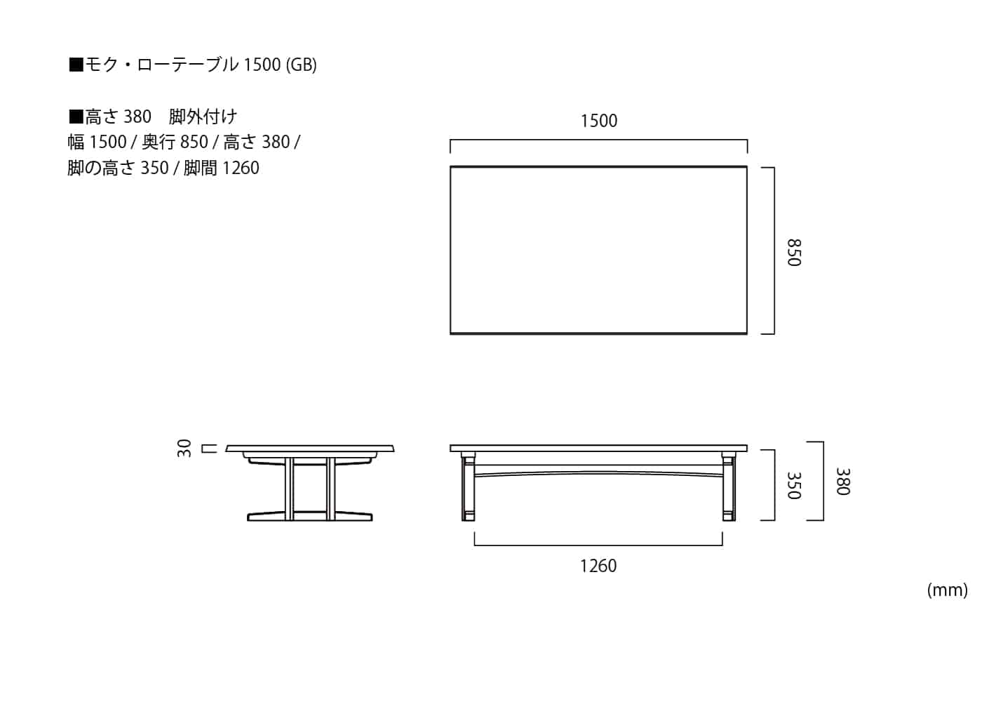 幅1500 / 奥行850 / 高さ380 / 脚の高さ350 / 脚間 1260