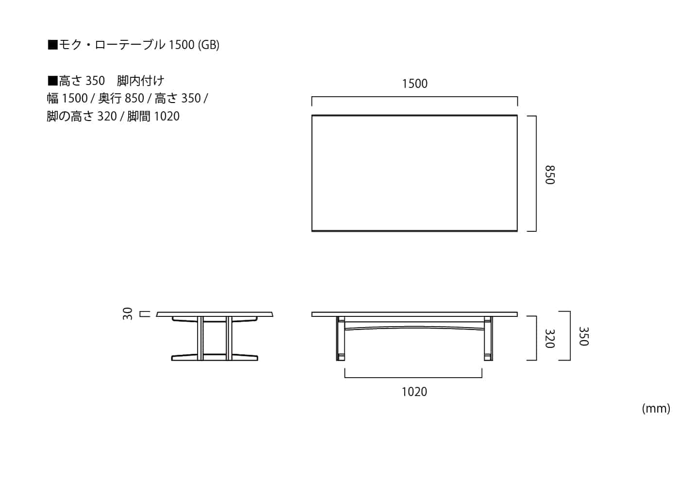 幅1500 / 奥行850 / 高さ350 / 脚の高さ320 /脚間 1020