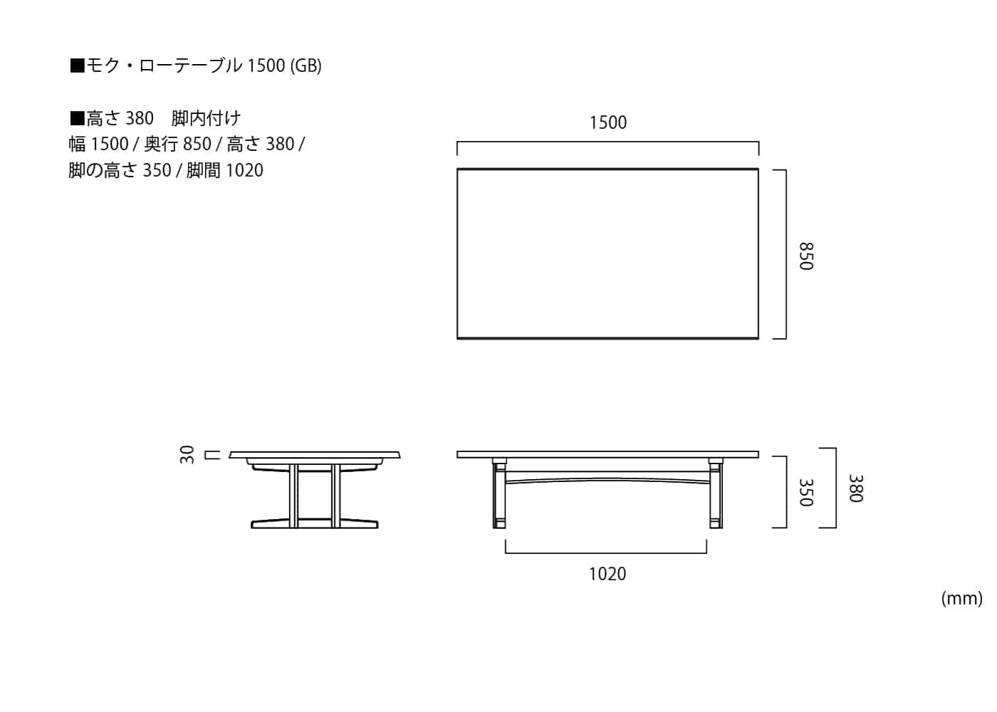 幅1500 / 奥行850 / 高さ380 / 脚の高さ350 /脚間 1020