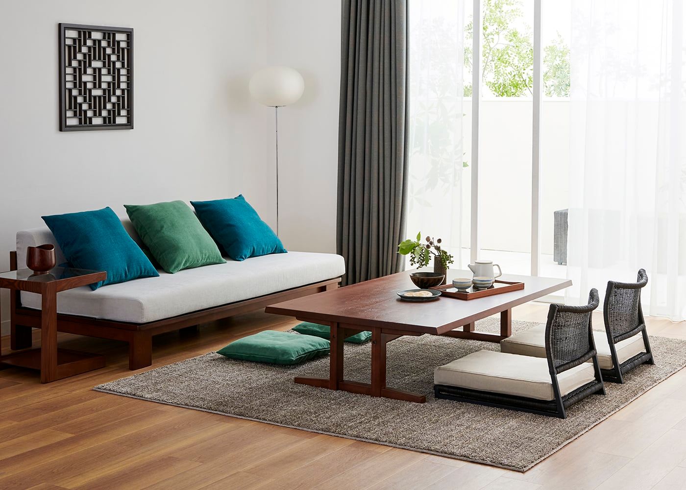 【組み替え例1】引っ越しで間取りが変わり、ソファで食事が楽しめるソファダイニングにしたい時には、別売りのモク・ロー/ソファダイニングテーブル 1500用脚(GB)に変えて組み立てると、モク・ソファダイニングテーブル 1500(GB)として生まれ変わります。(組み替えの際、別途家具解体費用が掛かる場合がございます。写真は脚内付け)