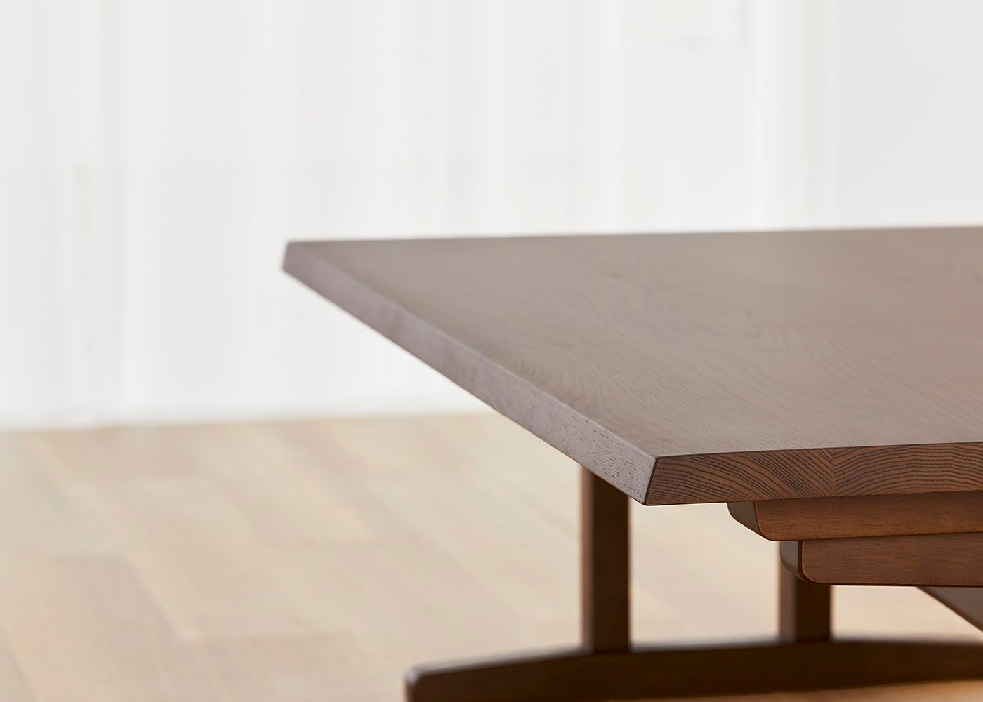 天板にはアッシュ無垢材を使用。無垢材でしか感じることのできない、やさしい手触りと木の温もりに癒されます。世界に一つだけの木目をお楽しみください。時を重ねるごとに表情が変化して味わい深くなっていくのも無垢材の魅力です。また、美しい木目を引き出すために、オイルステインを使用したグレインブラウン色を採用しています。