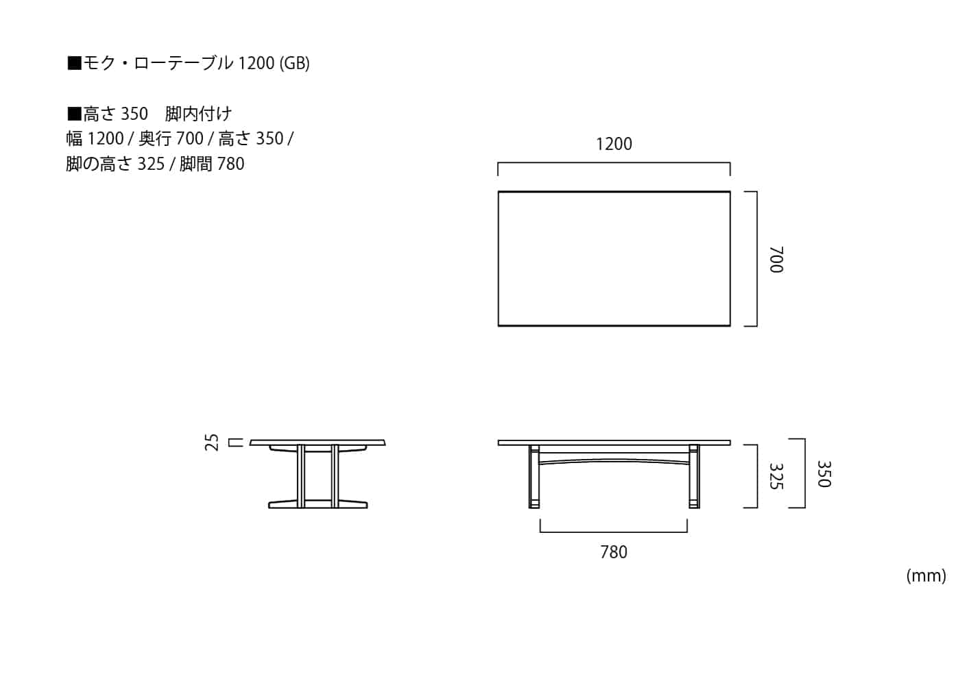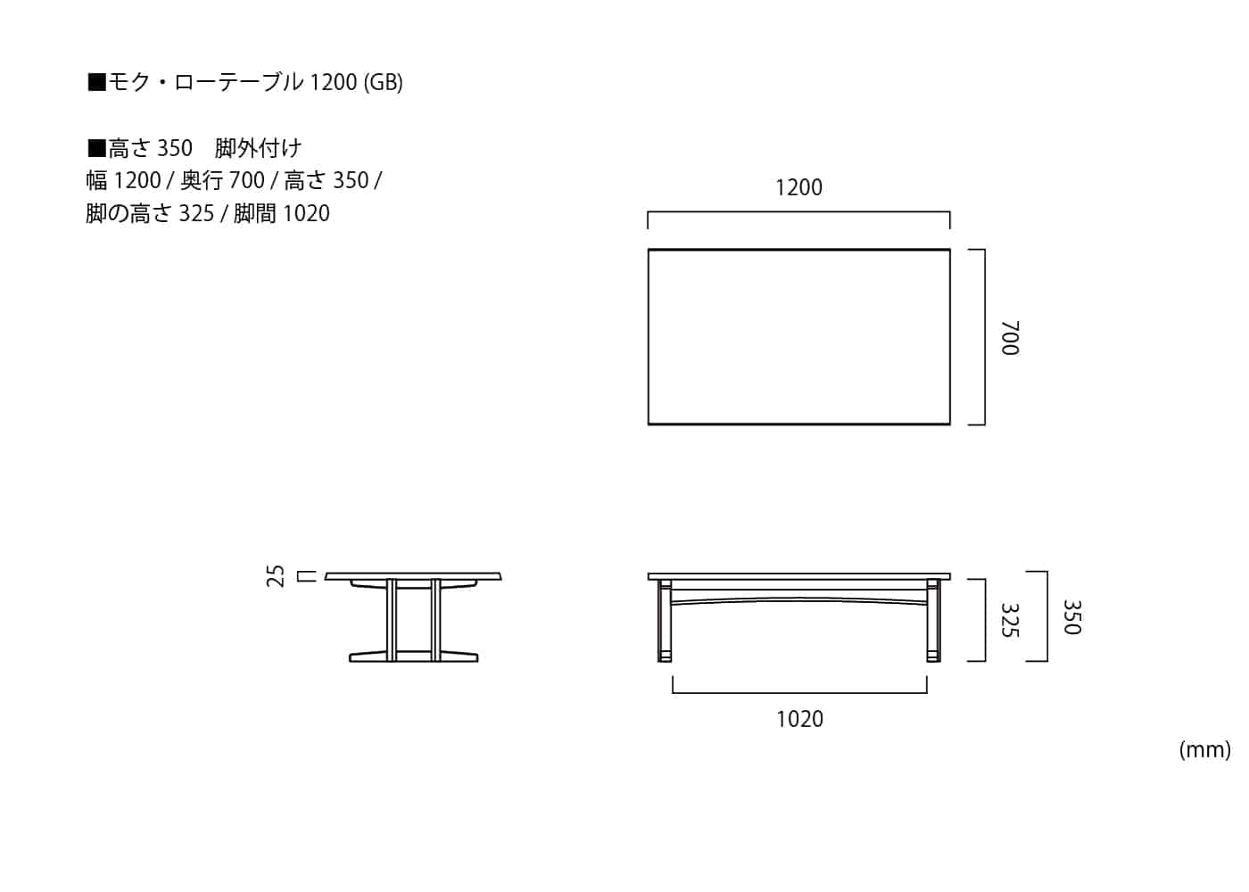 幅1200 / 奥行700 / 高さ350 / 脚の高さ325 / 脚間 1020