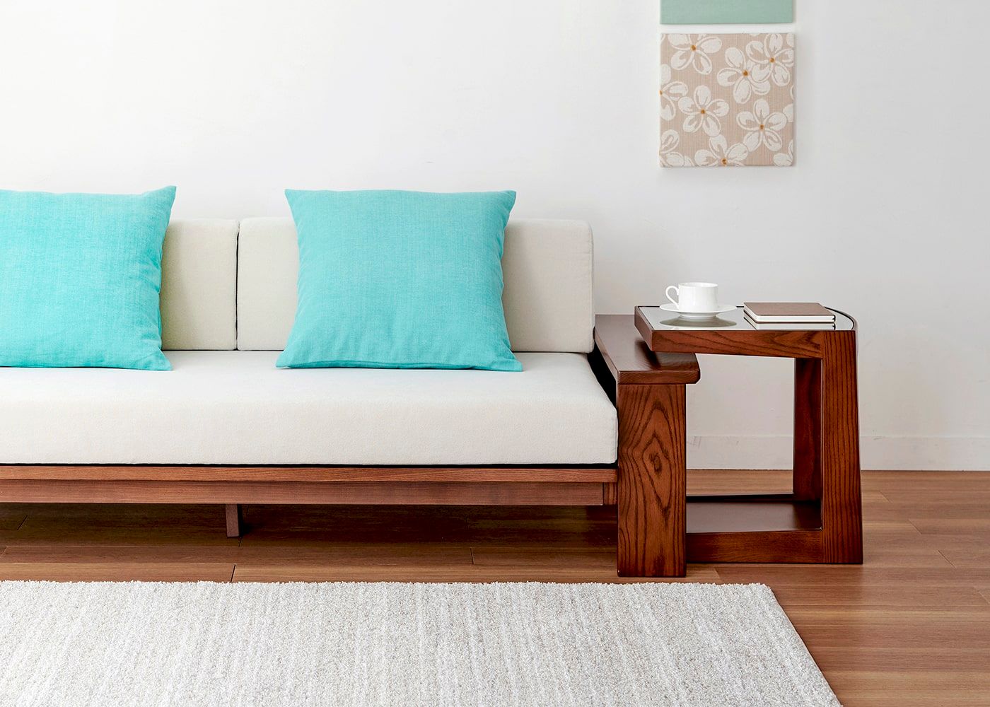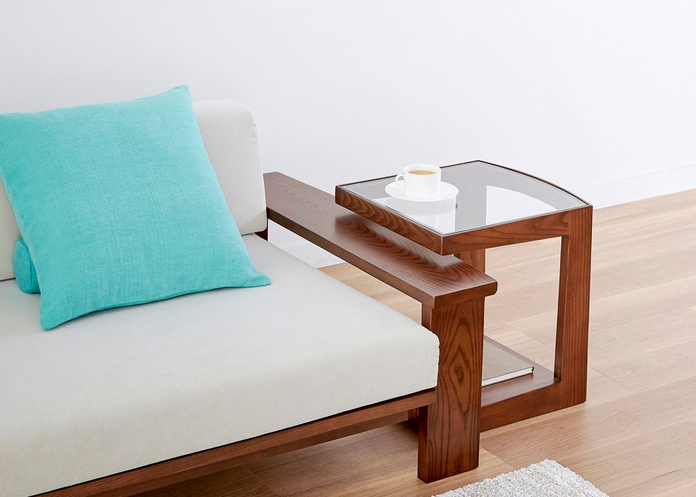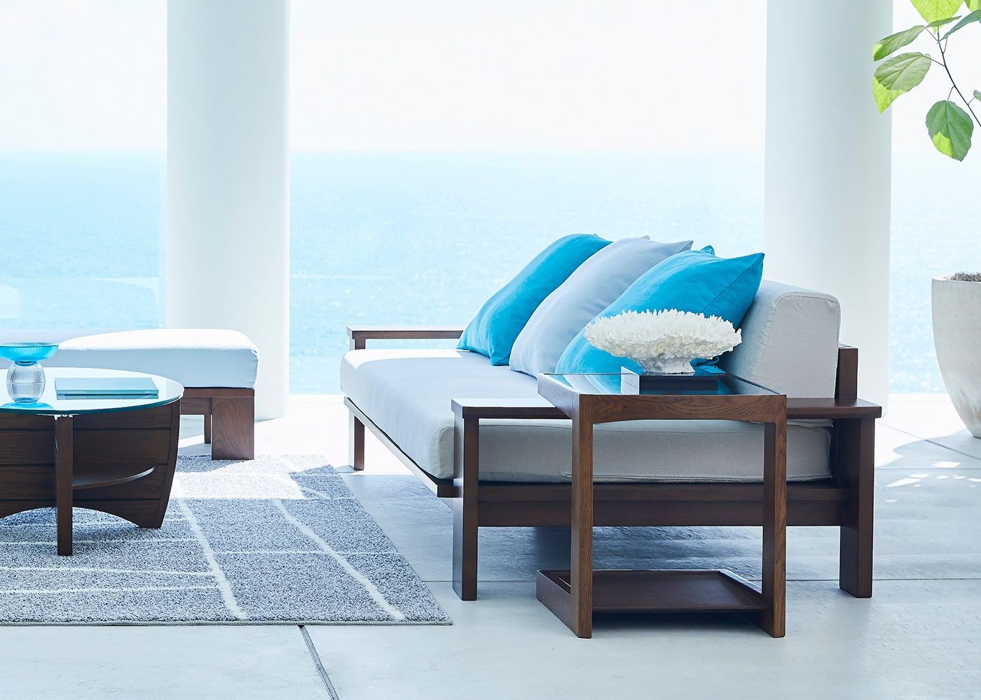 同シリーズのセイル・ローソファやローテーブルと合わせることで、空と海が広がる開放的な空間をより爽やかなイメージに演出できます。また、コの字型のテーブルによってソファのアームに差し込めるのも大きな魅力です。ソファと天板の距離が近くなることで、より快適に過ごすことができるでしょう。