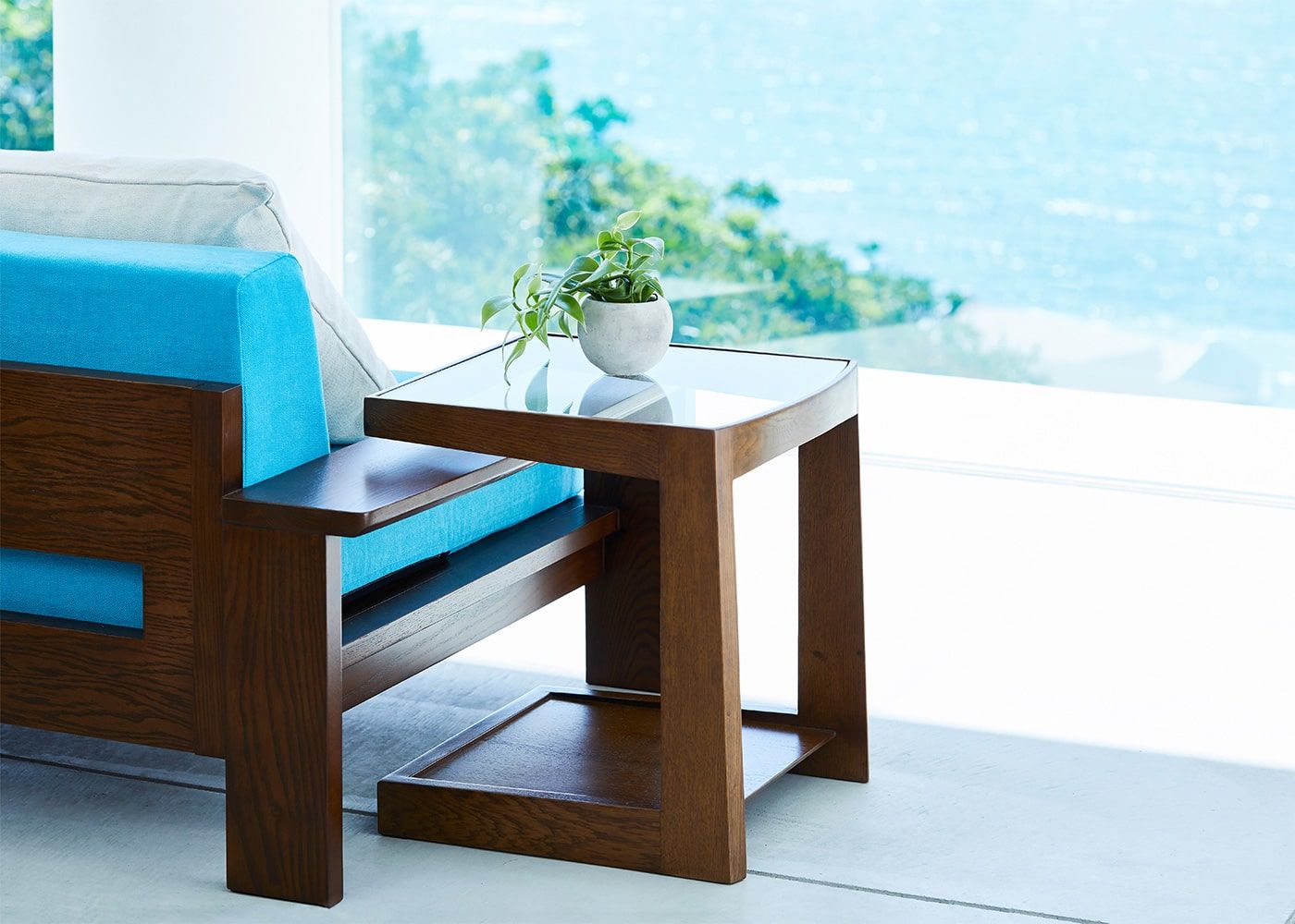 木の温もりを感じる無垢材のフレームに、透明感のあるガラス天板を合わせたセイル・サイドテーブル (GB)。海沿いらしい開放的なブルーで統一した空間とも調和しやすく、ソファ周りのインテリア性や快適性もアップしてくれます。