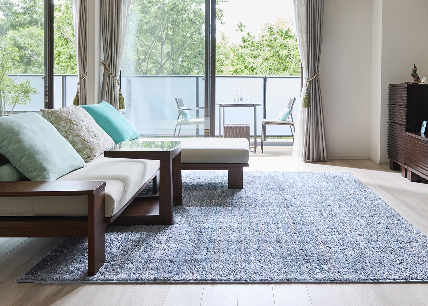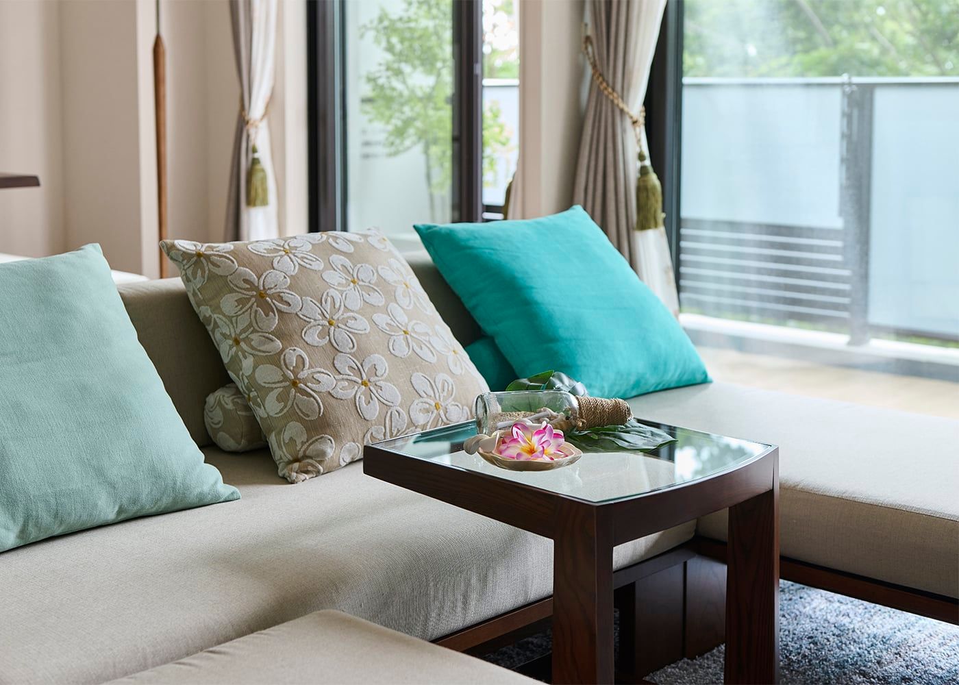 LDKの中心にローソファを配置した実例。ローテーブルも置かず、ソファ前をゆとりを感じる空間として演出しました。海辺のリゾートを想わせるエメラルドグリーンのカラーが映えます。