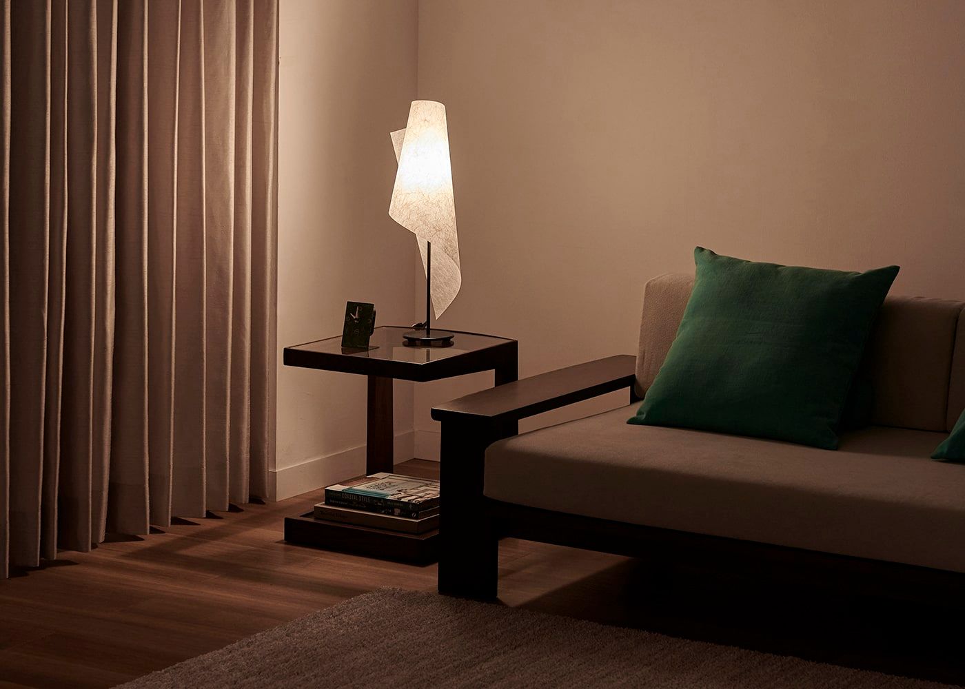 テーブルランプのやさしく柔らかい灯りが、ソファ周辺にアクセントと癒しをプラスしてくれます。