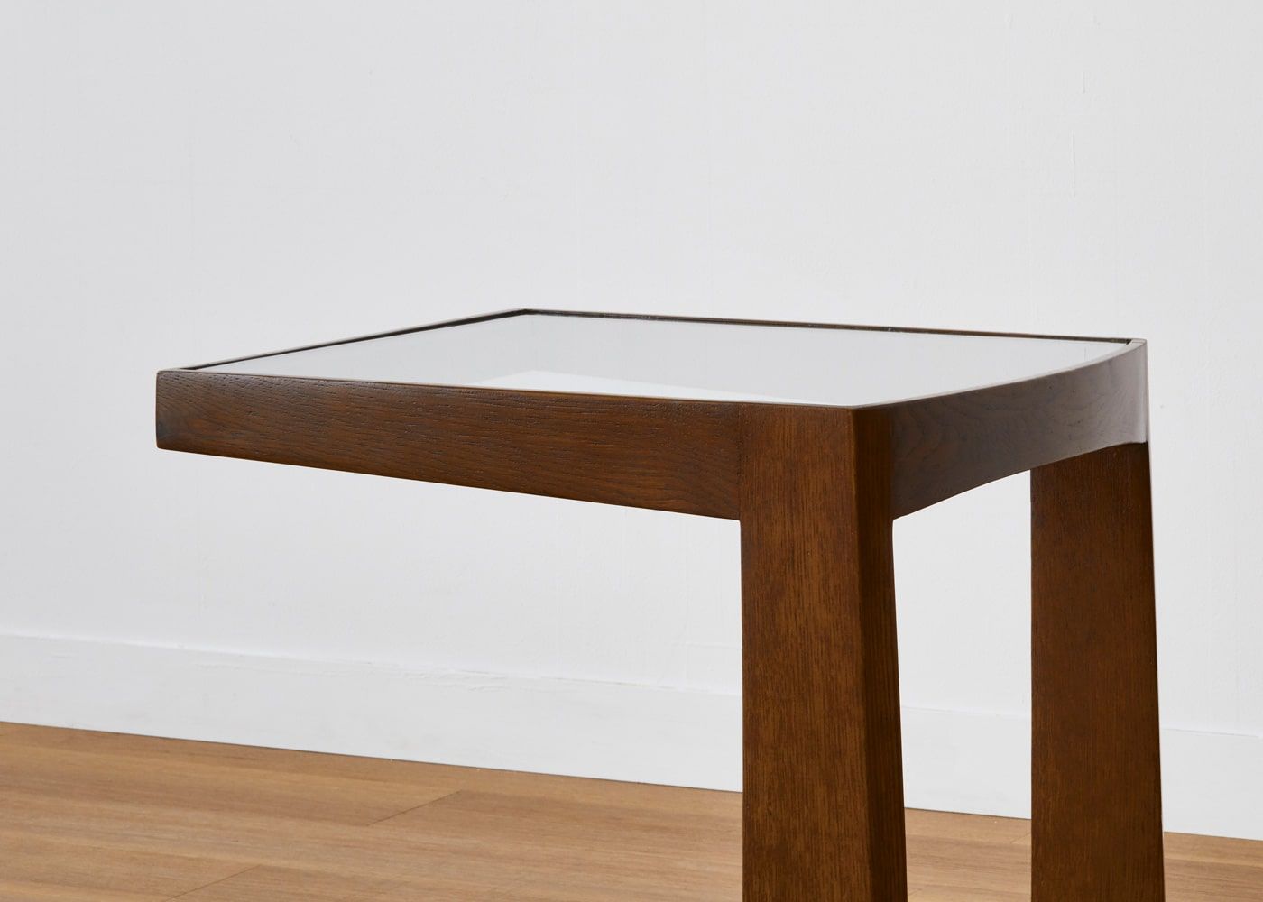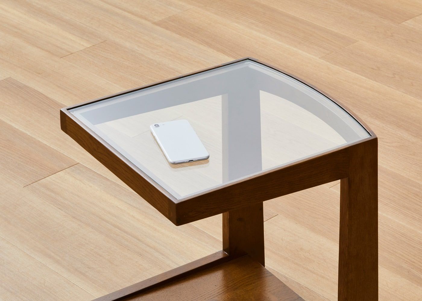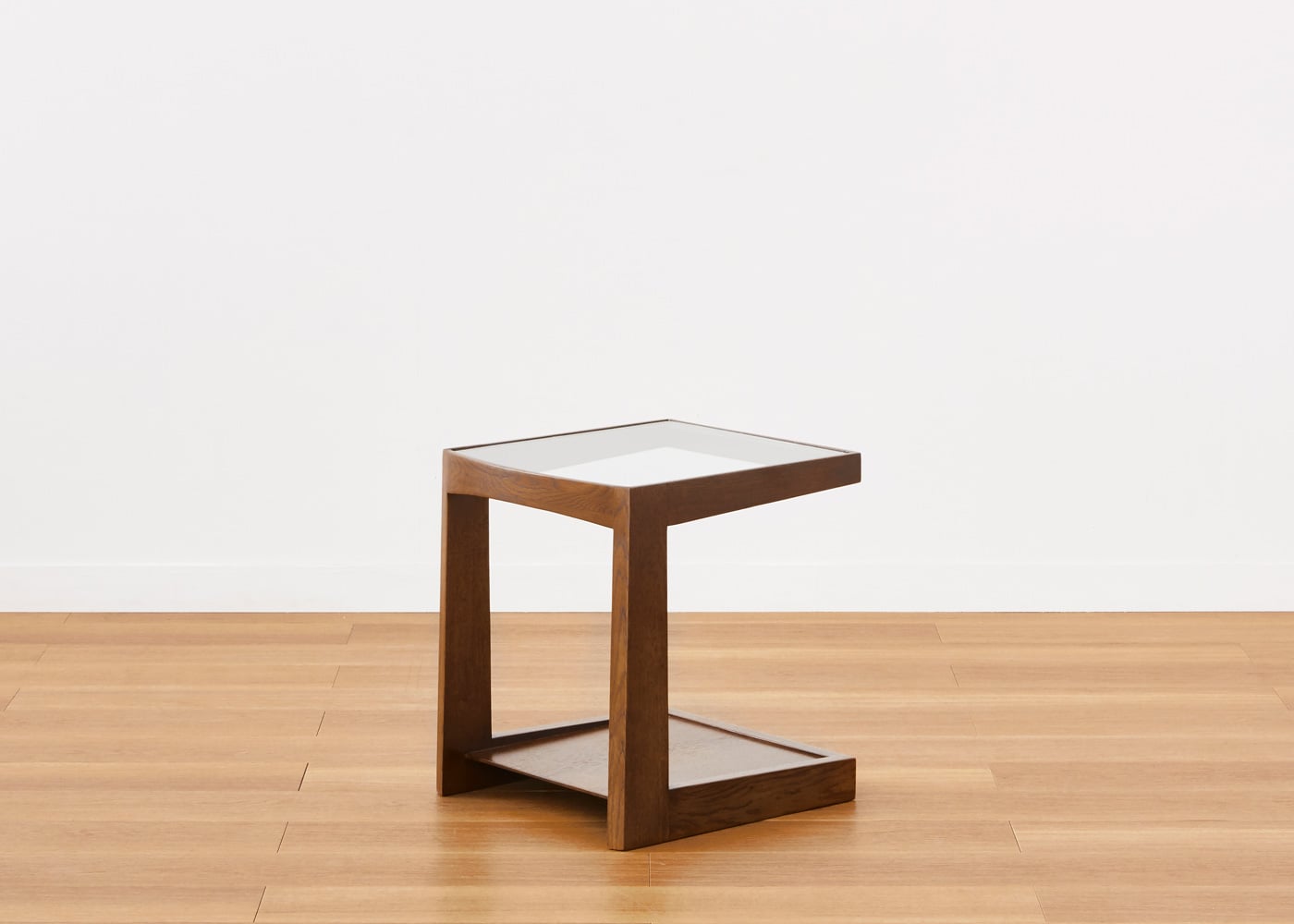 (GB)。コの字を描いた抜け感のあるデザインとガラス天板によって、海を行く船のような開放感のあるイメージに設計しました。リビングや寝室などを爽やかな印象に変えながら、より快適な暮らしも叶えてくれるサイドテーブルです。