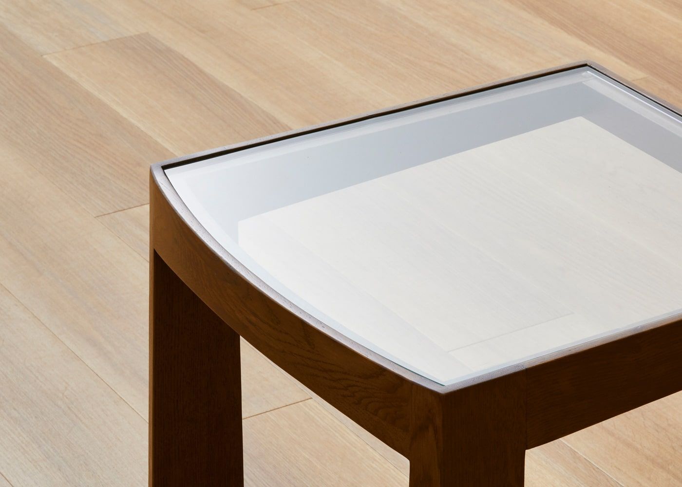 天板には開放感のある透明なガラス天板を採用。また、天面の片側一辺のみ曲線を加えて、小舟らしいデザインに仕上げています。