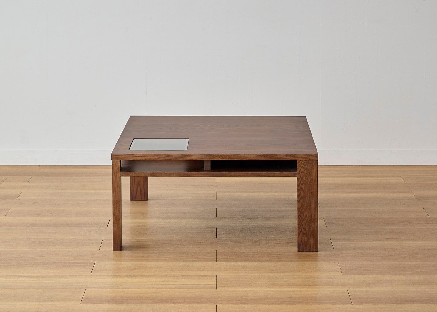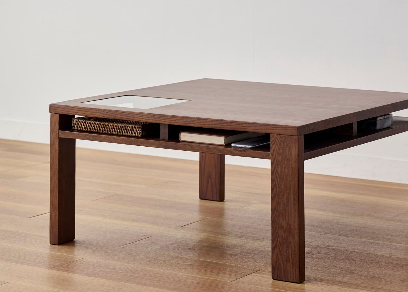 ソファや床座で食事も楽しめる、正方形のガラス・ローテーブル 800×800。ゲストが来た時も団欒しやすい、ゆったりしたサイズ感です。アッシュ無垢材を使用することで、迫力がありながらも落ち着いた雰囲気が演出できます。