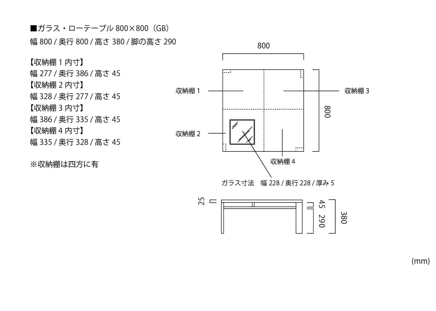 幅800 / 奥行800 / 高さ380 / 脚の高さ290 ※単位は mm