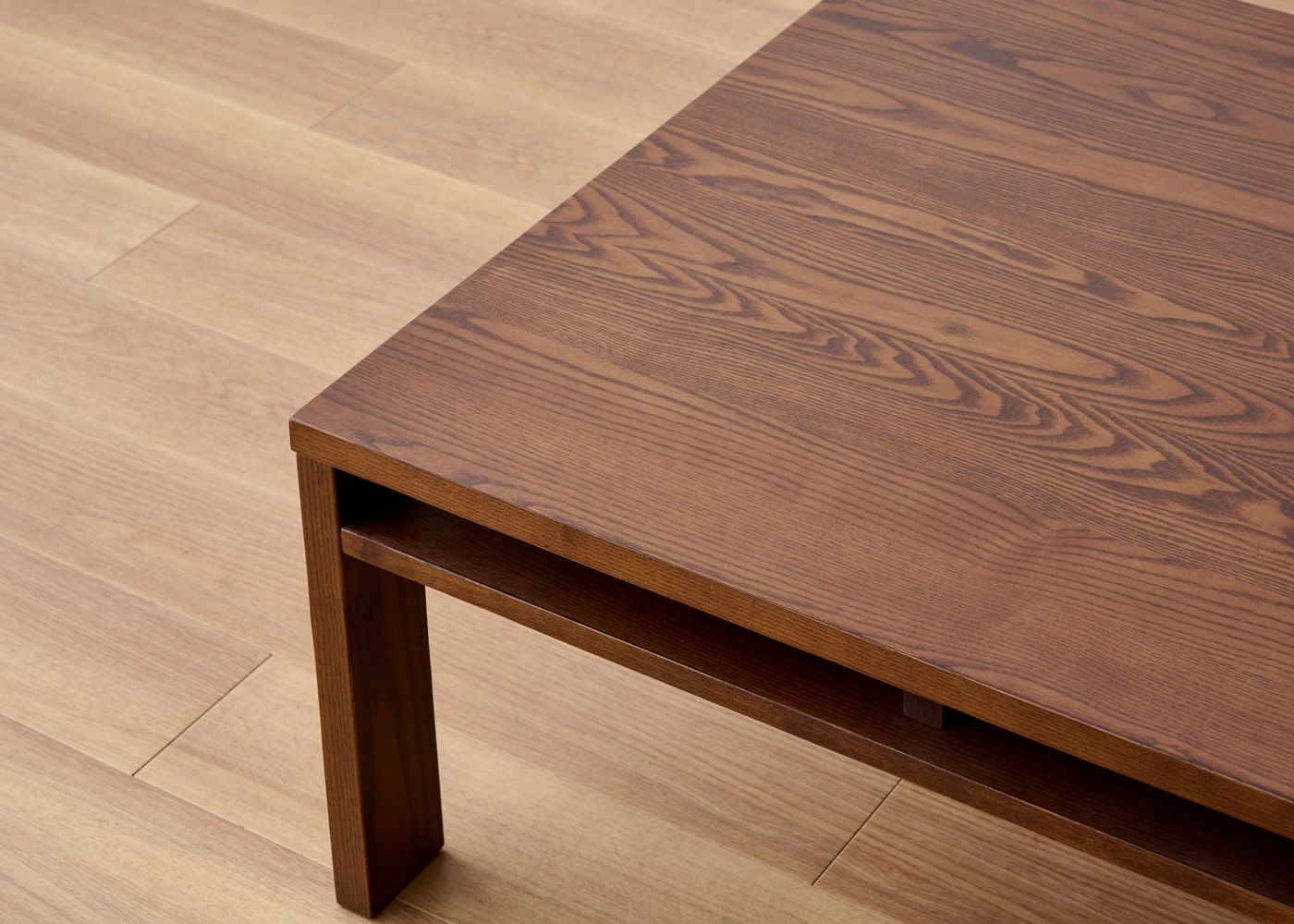 天板には美しい木目のアッシュ無垢材を使用。時を重ねるごとに表情が変化して味わい深くなっていくのも無垢材の魅力です。また、美しい木目を引き出すために、オイルステインを使用したグレインブラウン色を採用しています。
