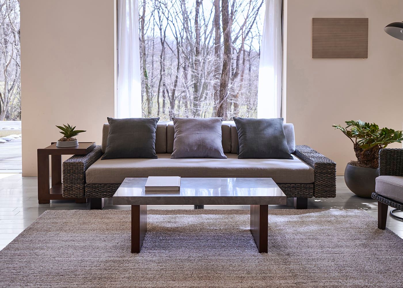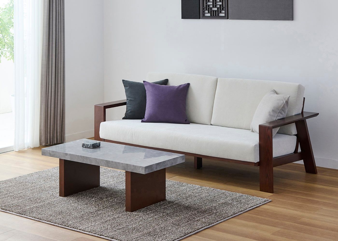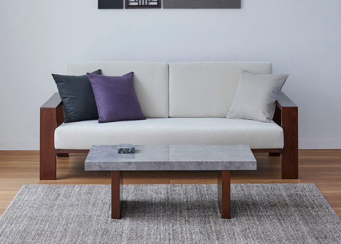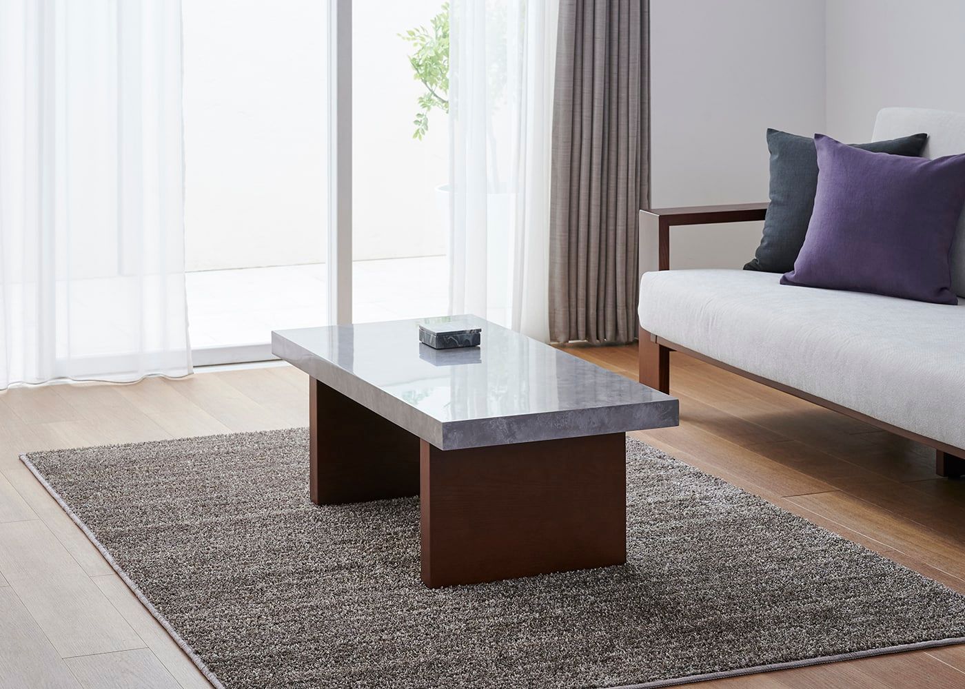 グラン・ローテーブルは、ローソファはもちろん、ウッド素材のスタンダードソファとの相性も良いのが魅力。ウッドと石、グレー×パープルカラーが調和した大人なコーディネートが実現できます。(写真は1000タイプ 脚内付け。ソファは幅1830mm)