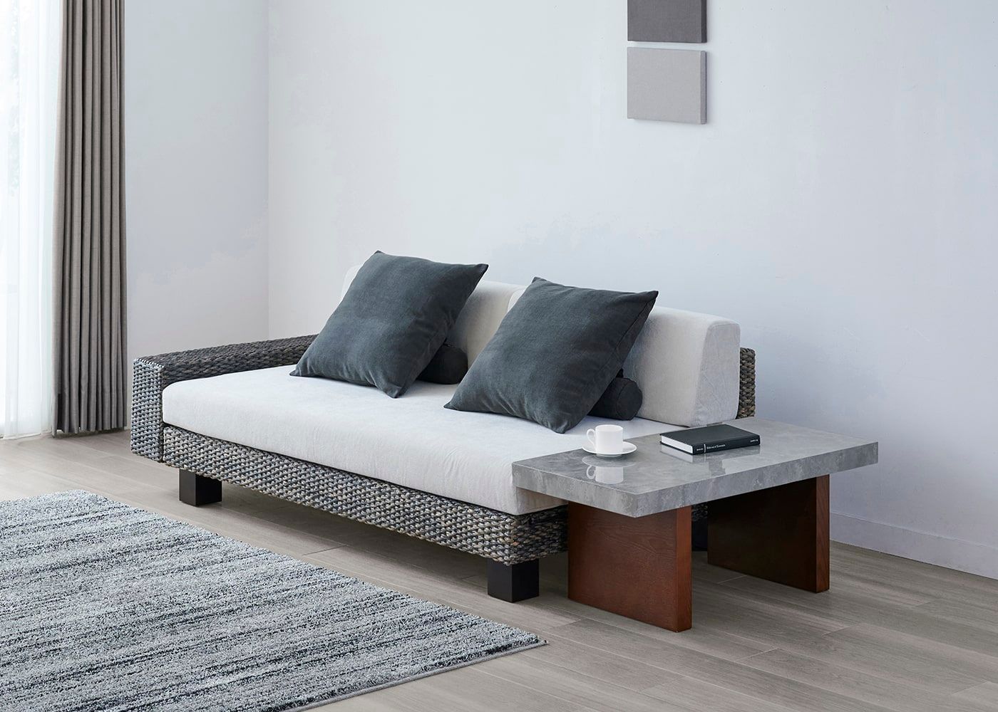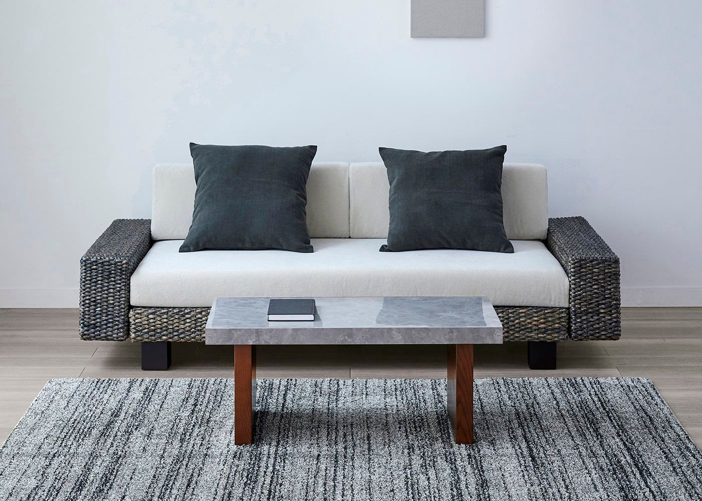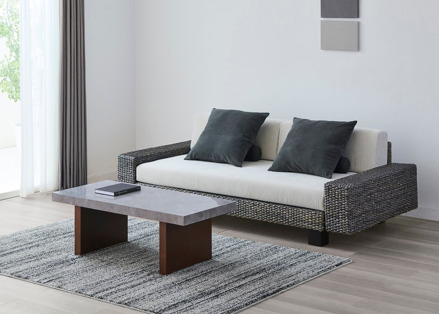 グラン・ローテーブルは、ローソファはもちろん、ウッド素材のスタンダードソファとの相性も良いのが魅力。ウッドと石、グレー×パープルカラーが調和した大人なコーディネートが実現できます。(写真は1000タイプ 脚内付け。ソファは幅1830mm)
