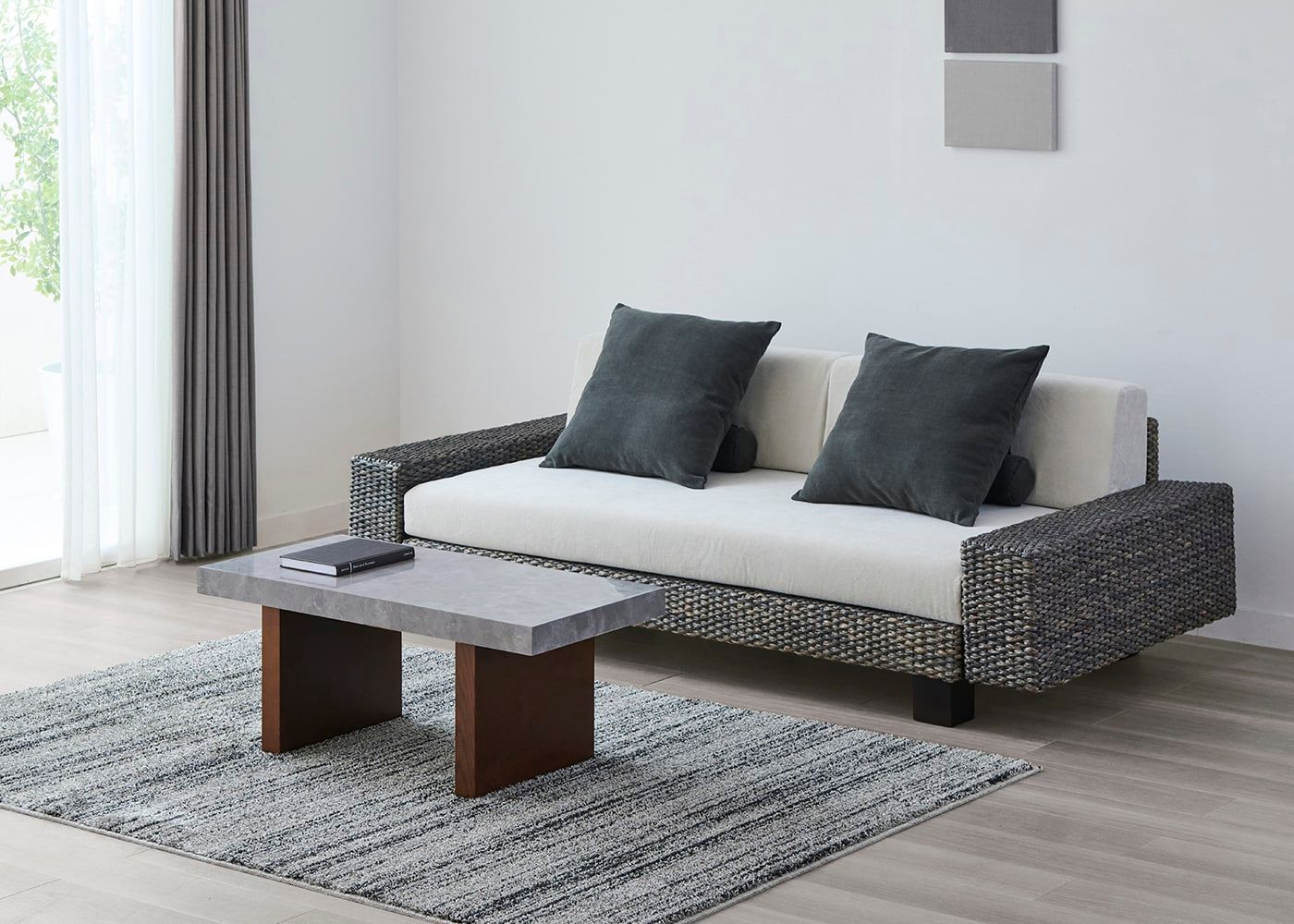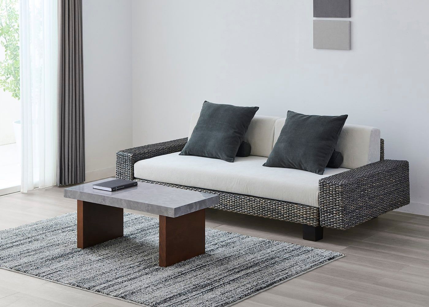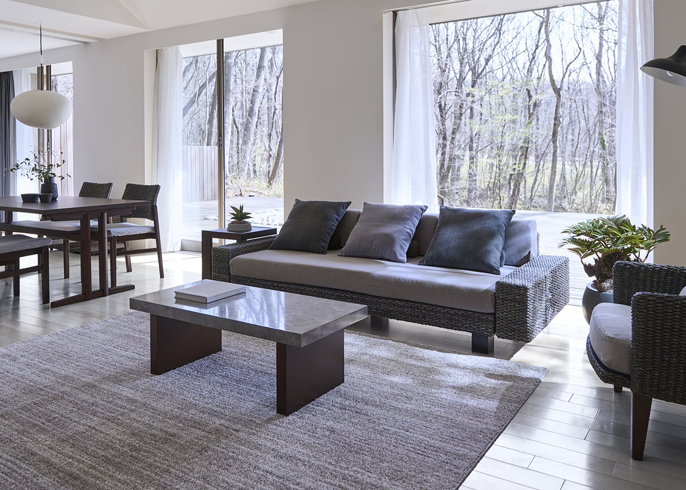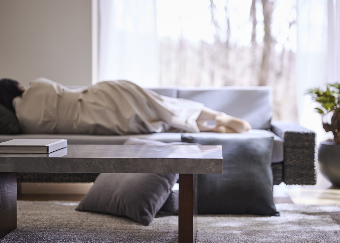 グラン・ローテーブルは、ローソファはもちろん、ウッド素材のスタンダードソファとの相性も良いのが魅力。ウッドと石、グレー×パープルカラーが調和した大人なコーディネートが実現できます。(写真は1000タイプ 脚内付け。ソファは幅1830mm)