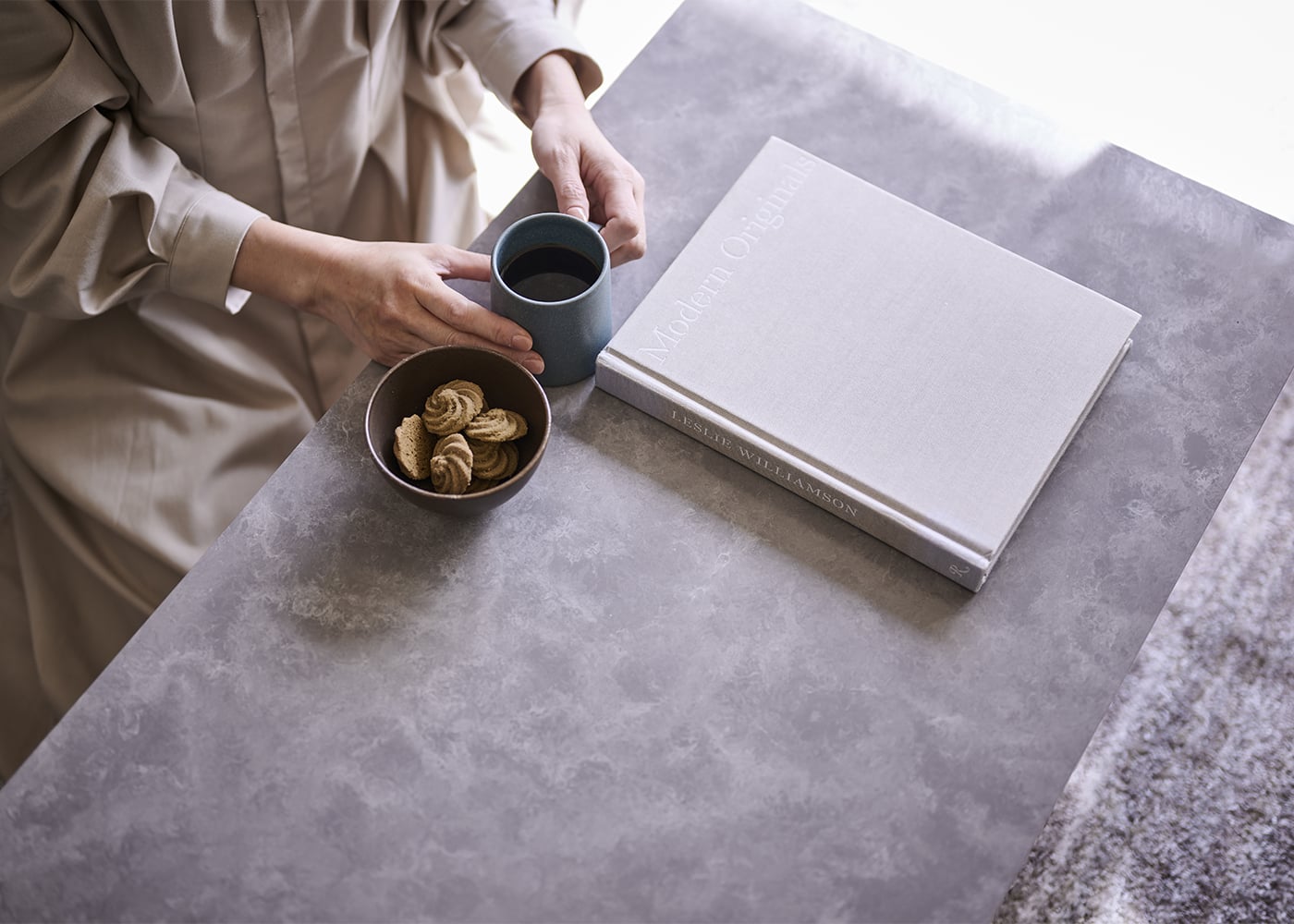 程よい艶感を持ったグレー色の天板は、リゾートインテリアはもちろん、モダンからラグジュアリーまでどんなインテリアにも調和してくれます。