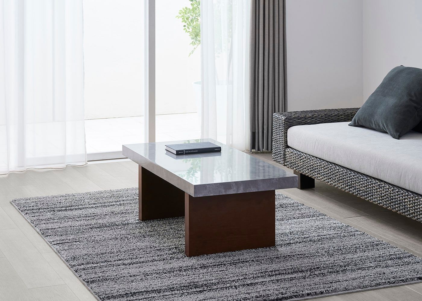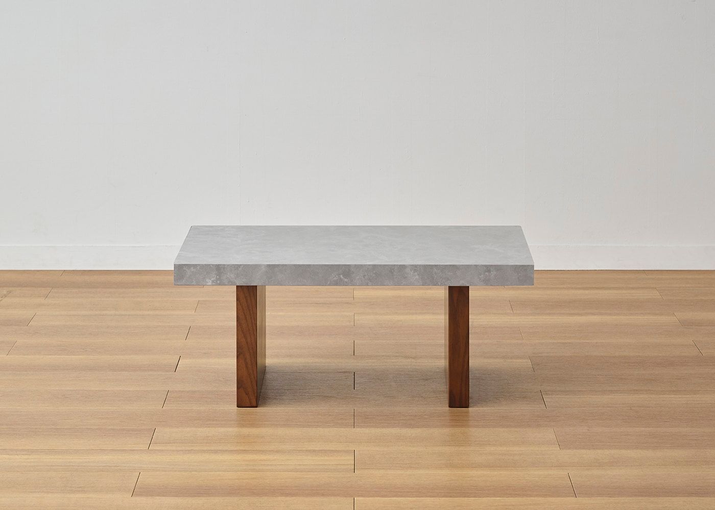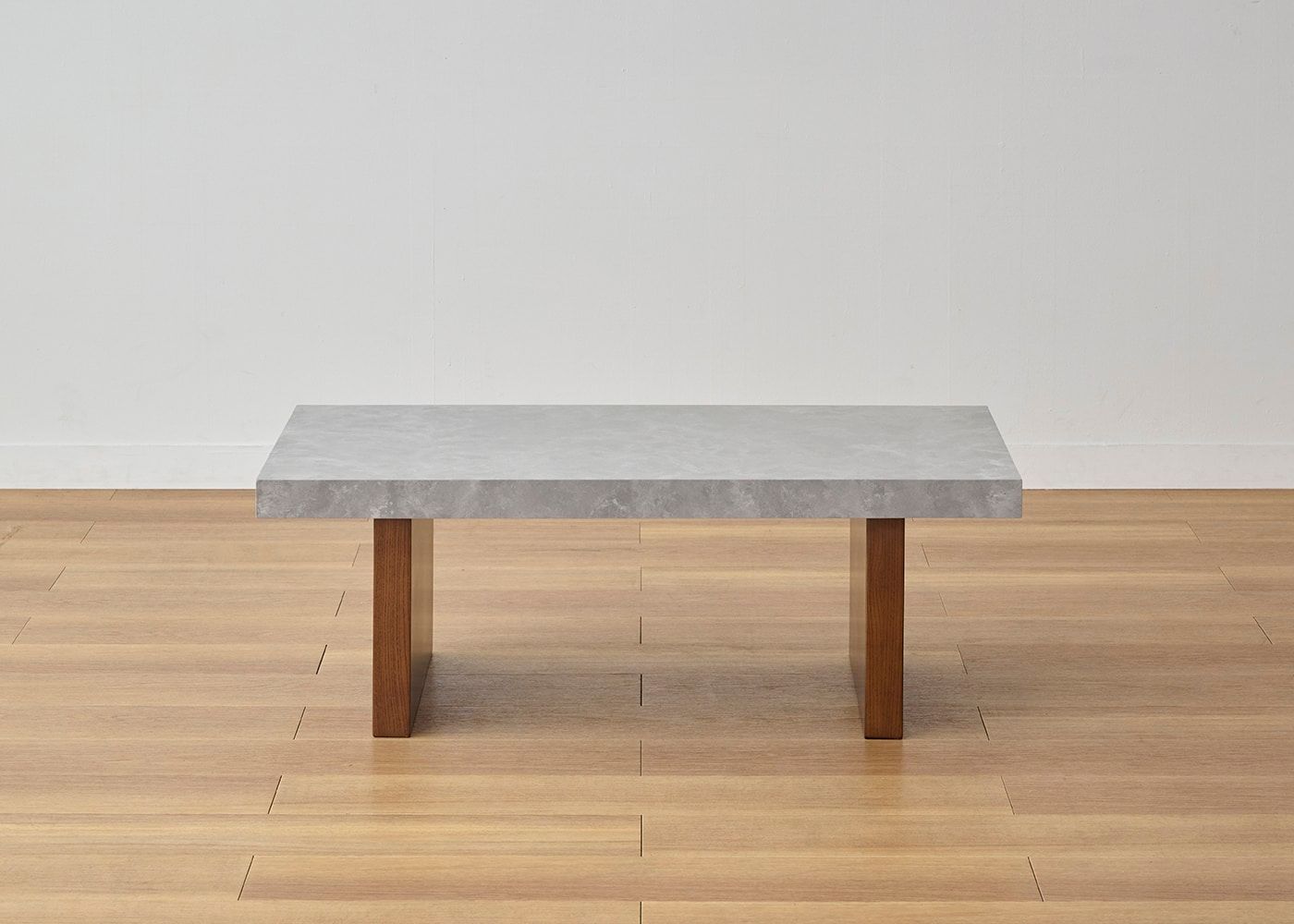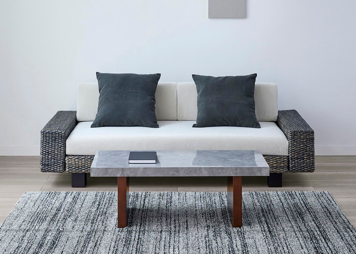 どんなソファとも合わせやすい、水平垂直で構成されたシンプルで潔いデザイン。天板の石の素材感や存在感がより際立ちます。(写真は1000タイプ 脚内付け。ソファは幅1830mm)