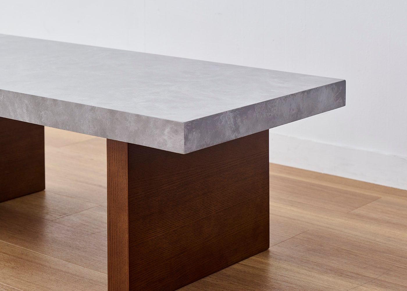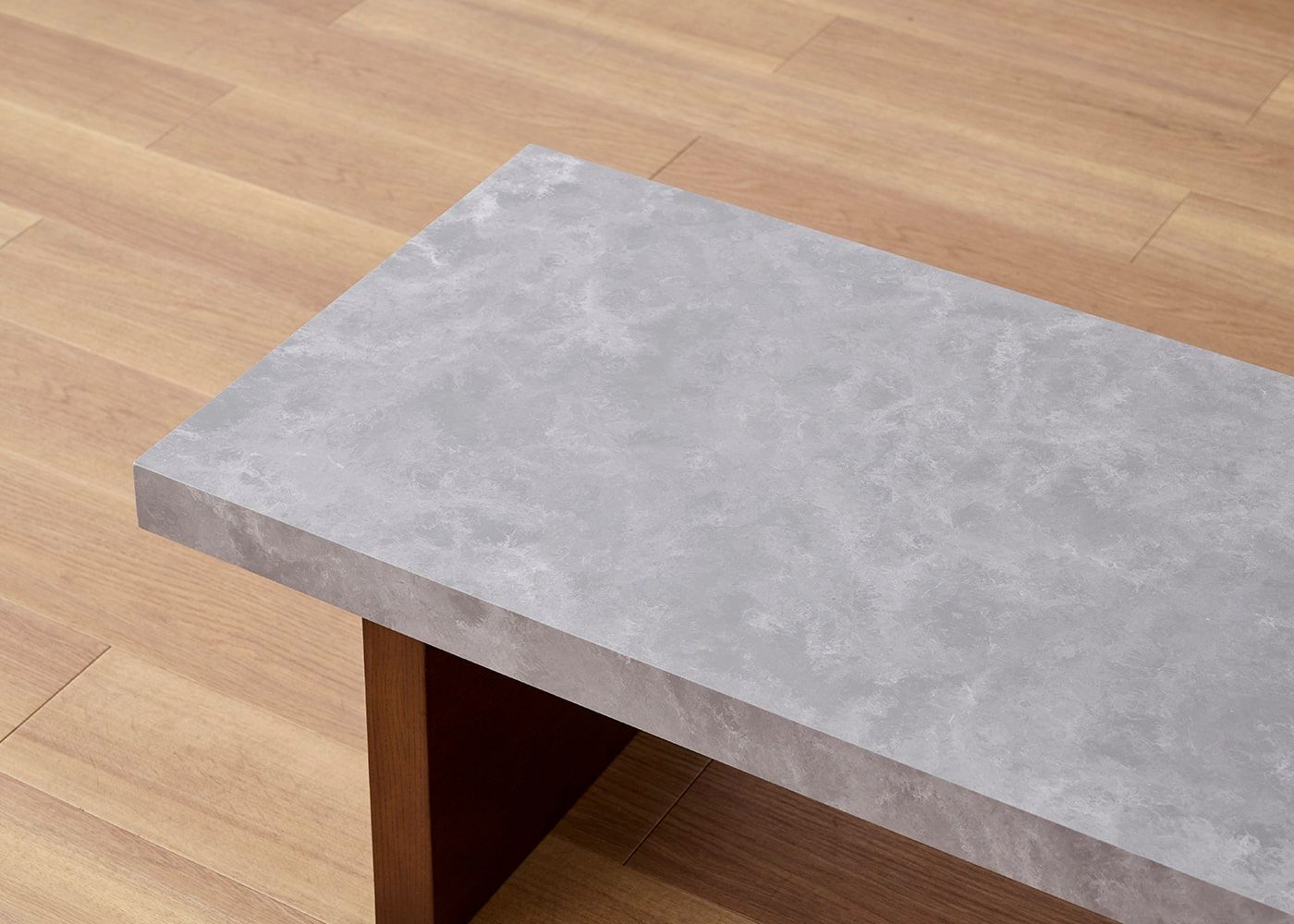 正面から見ると、厚みのあるソリッドな石天板と脚で構成されたシンプルなデザイン。板状の脚を採用しているため、4本脚のテーブルに比べて空間がすっきり見えるメリットがあります。(写真は1000タイプ 脚内付け)
