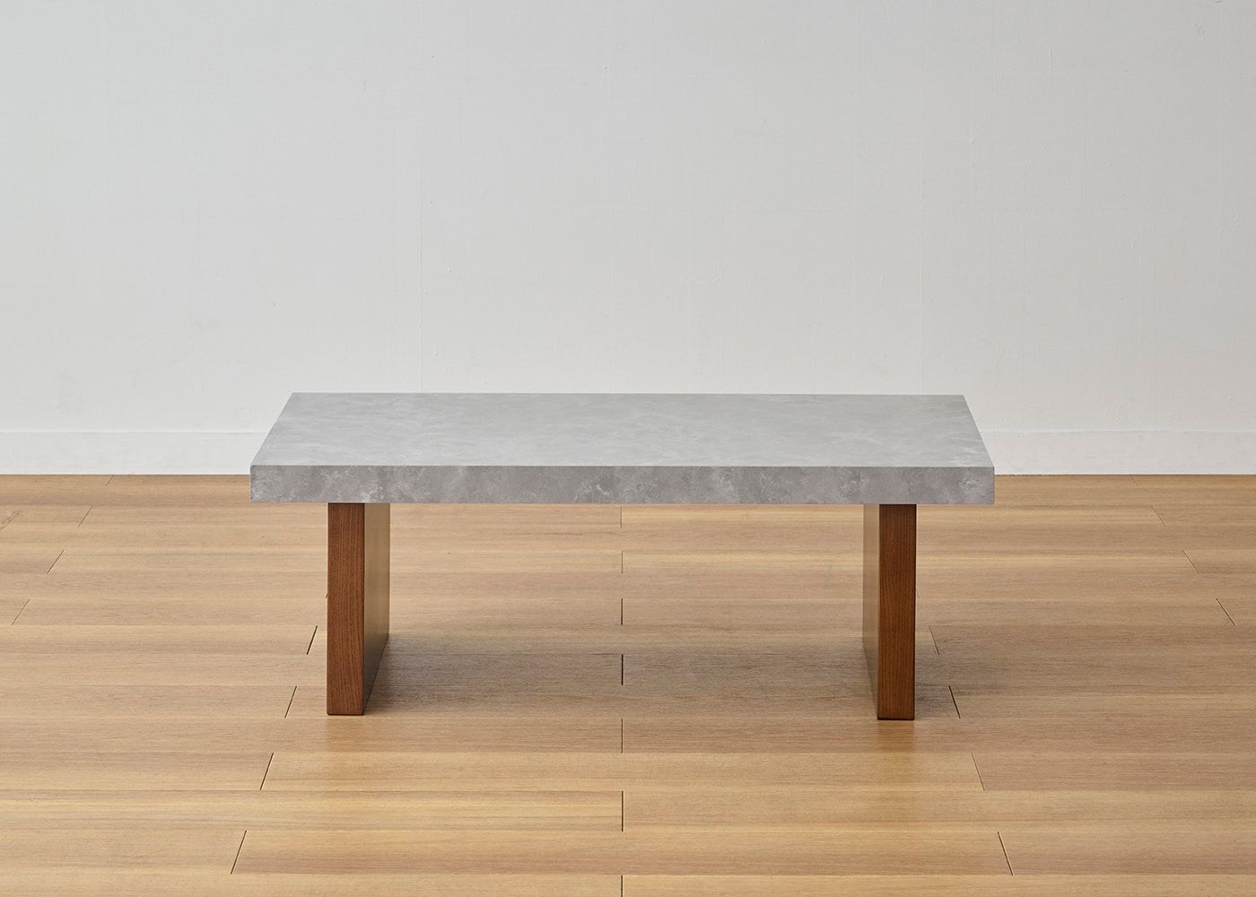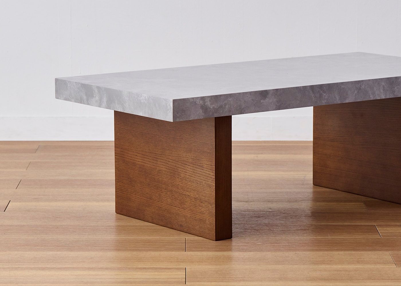 グラン・ローテーブルは、厚みのあるソリッドな人工大理石の天板が魅力。脚はダイナミックな木目のアッシュ材を採用。石と木という異素材を組み合わせたローテーブルです。(写真は1000タイプ 脚内付け)