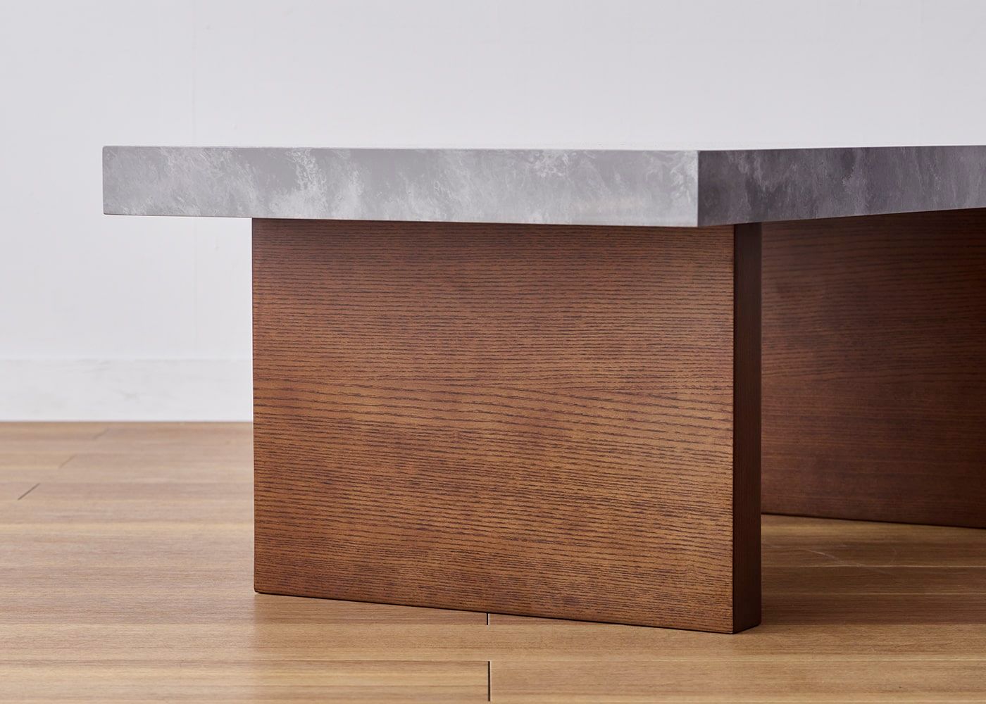 グラン・ローテーブルは高級感のあるグレーの石天板が最大の特長。また、脚にはアッシュ材のダイナミックな木目と素材感を取り入れることで、大地の雄大さを表現しました。(写真は1000タイプ 脚内付け)