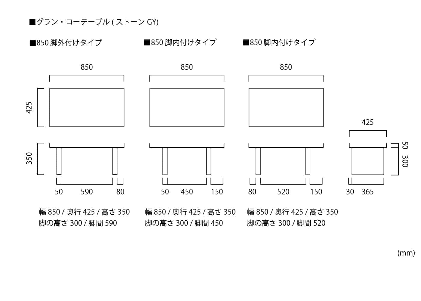 幅850 / 奥行425 / 高さ350 / 脚の高さ300