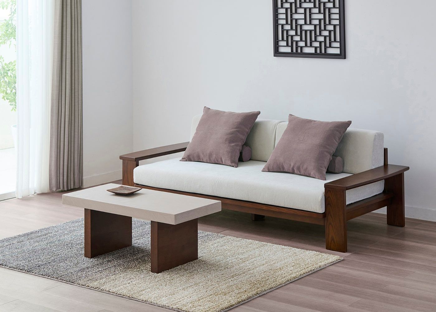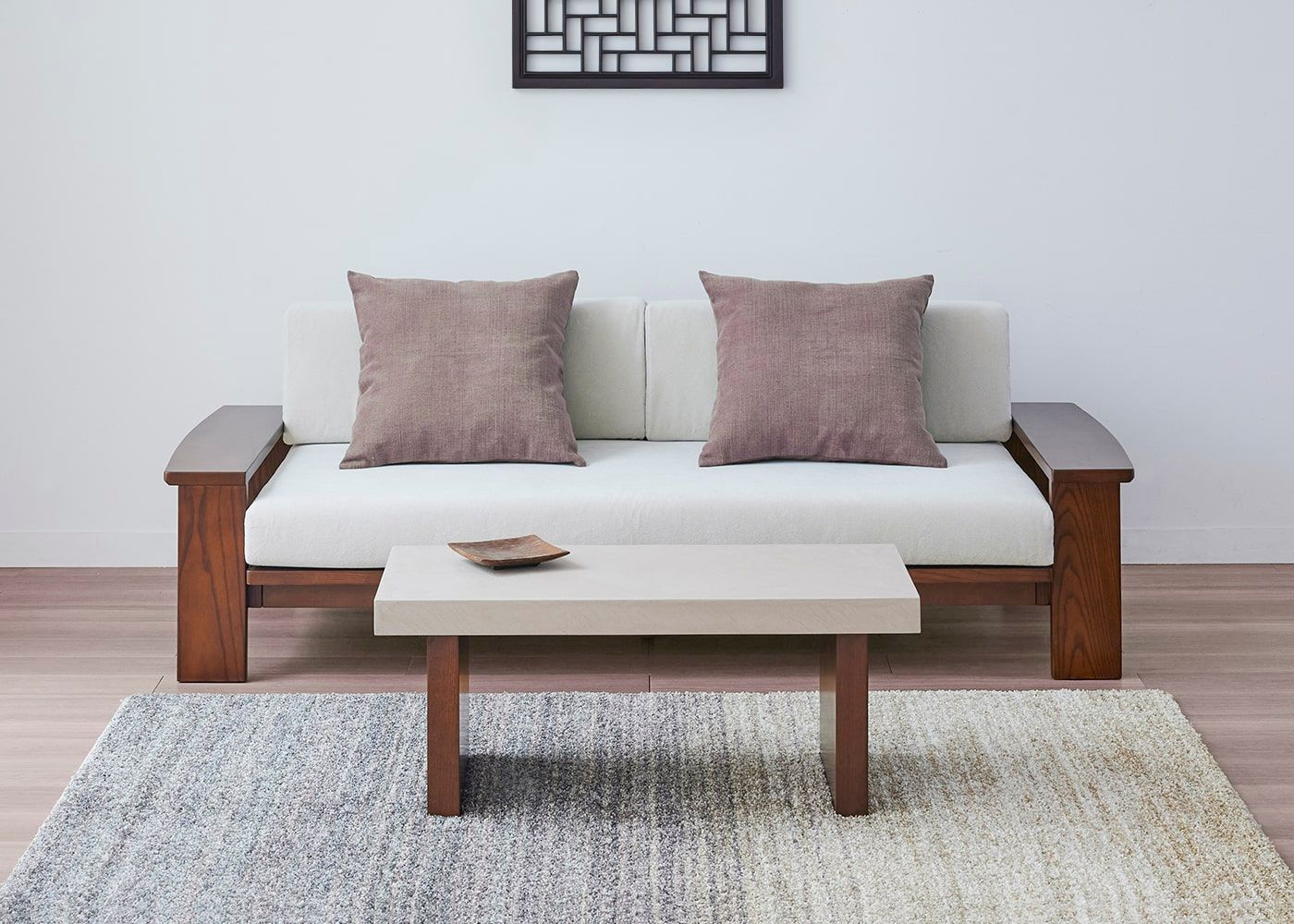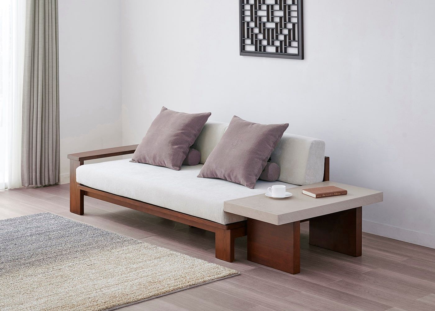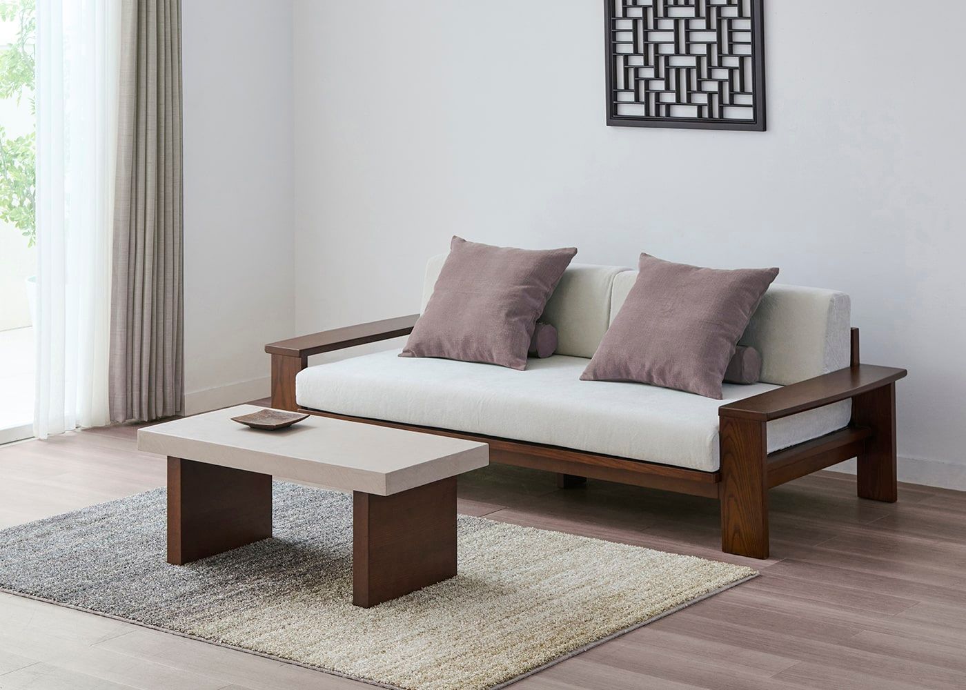 ケイ・ローソファの奥行に近い天板幅。ソファの横に置いて広めのサイドテーブルとしても活用できます。ソファ座面に近い高さでシームレスな見た目になるため、ロースタイルなリビングにしたい方におすすめです。(写真は850タイプ 脚外内付け)