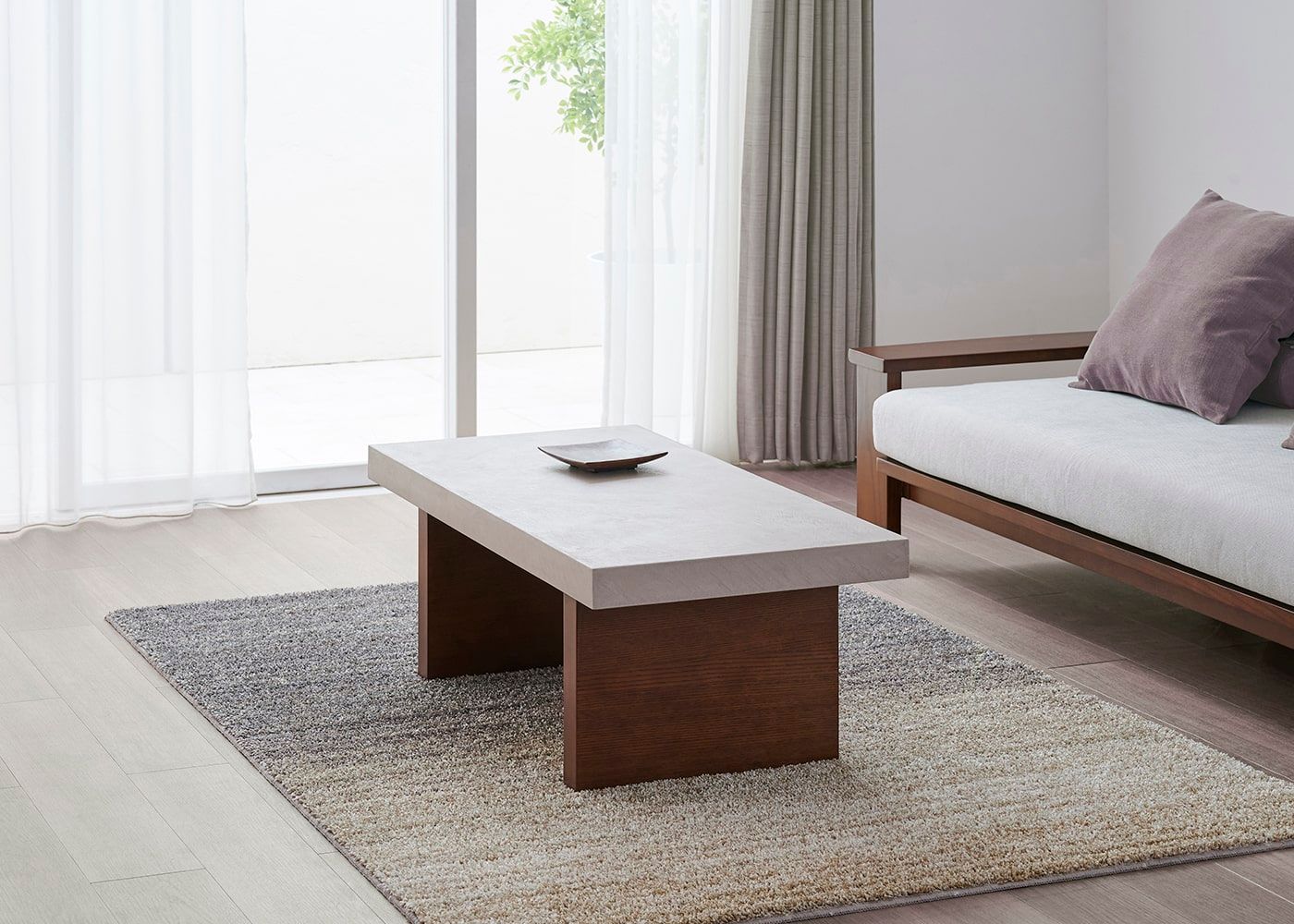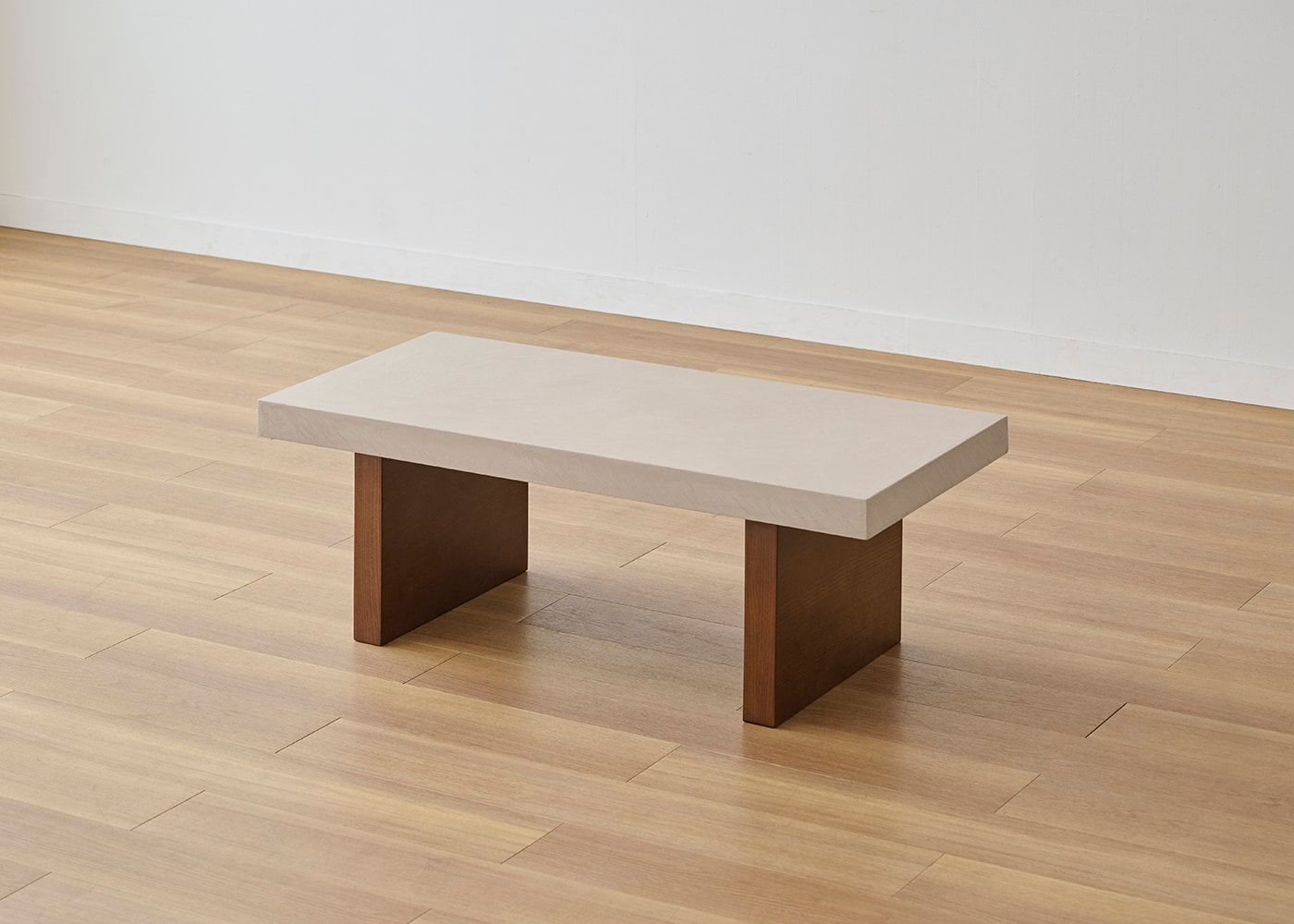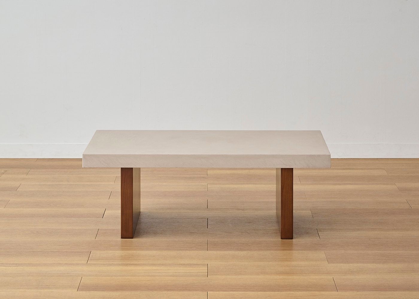グラン・ローテーブルは、コンクリートのような存在感とやさしい色合いの天板が魅力。脚はセイル・ローソファと同じアッシュ材と着色を施しているため、素材の温もり溢れる統一感のある空間を演出します。(写真は1000タイプ 脚内付け)