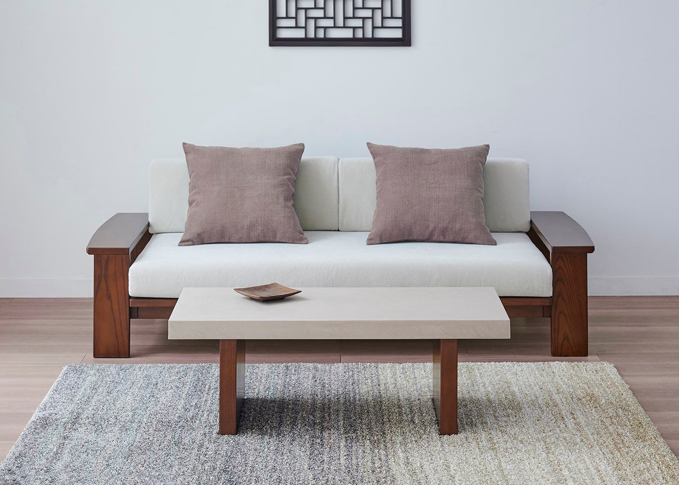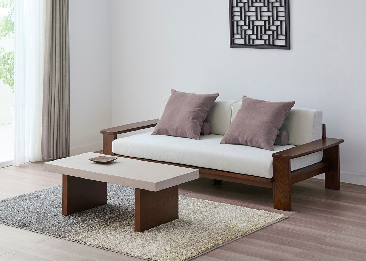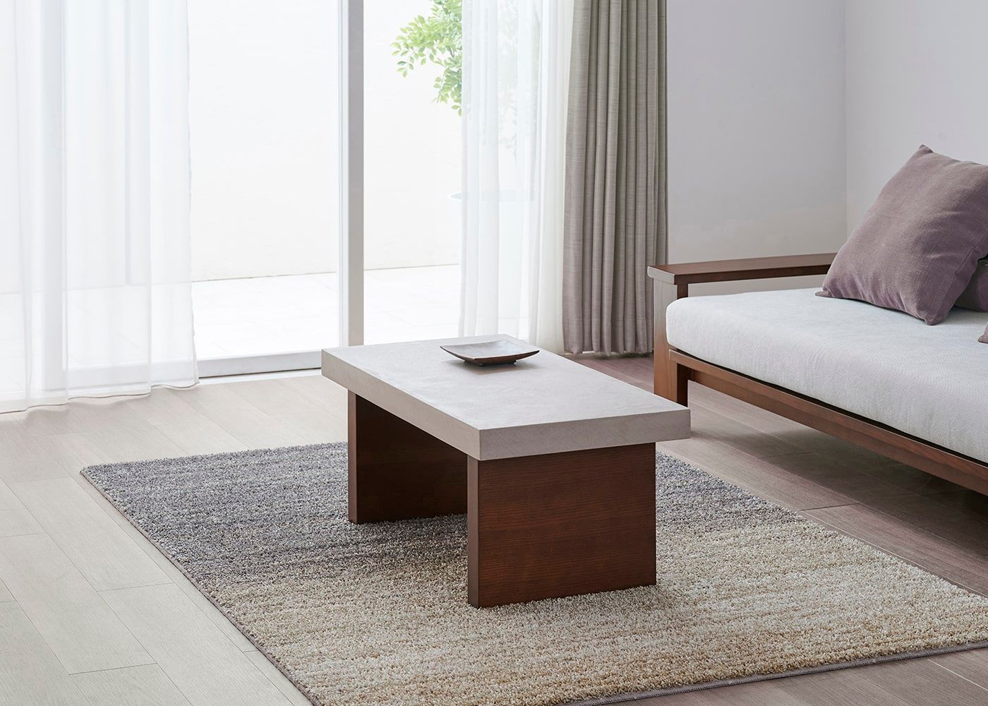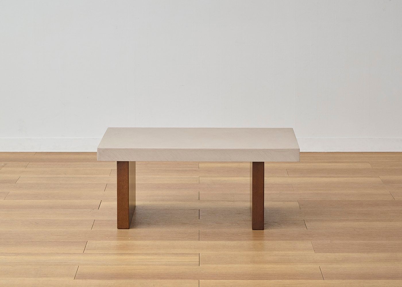 グラン・ローテーブルは、コンクリートのような存在感とやさしい色合いの天板が魅力。脚はセイル・ローソファと同じアッシュ材と着色を施しているため、素材の温もり溢れる統一感のある空間を演出します。(写真は1000タイプ 脚内付け)