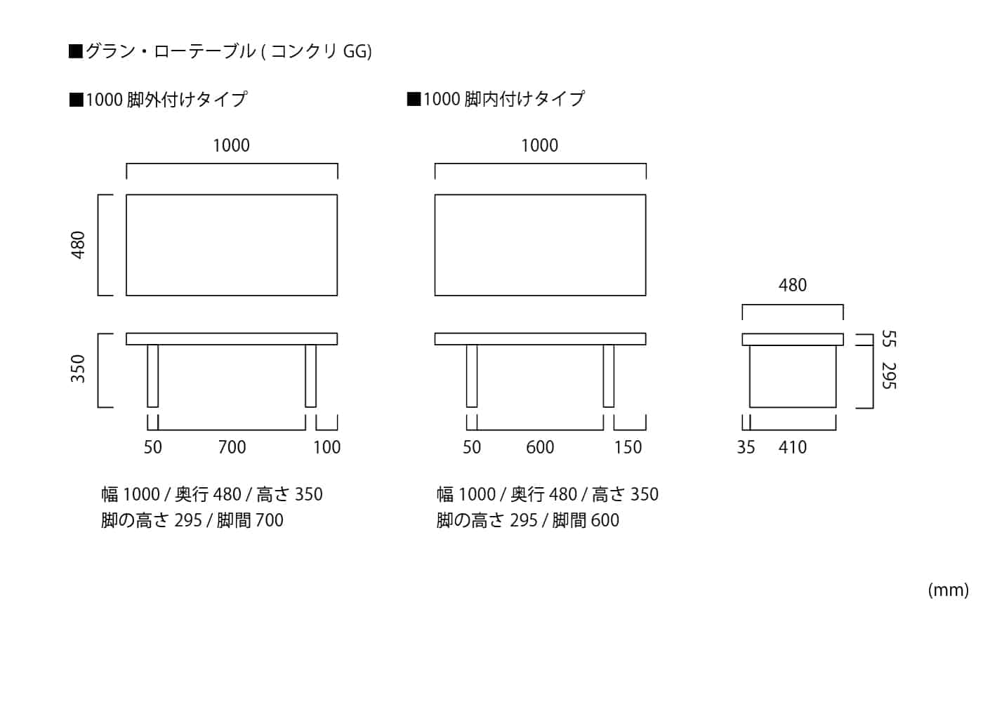 幅1000 / 奥行480 / 高さ350 / 脚の高さ300 ※単位は mm