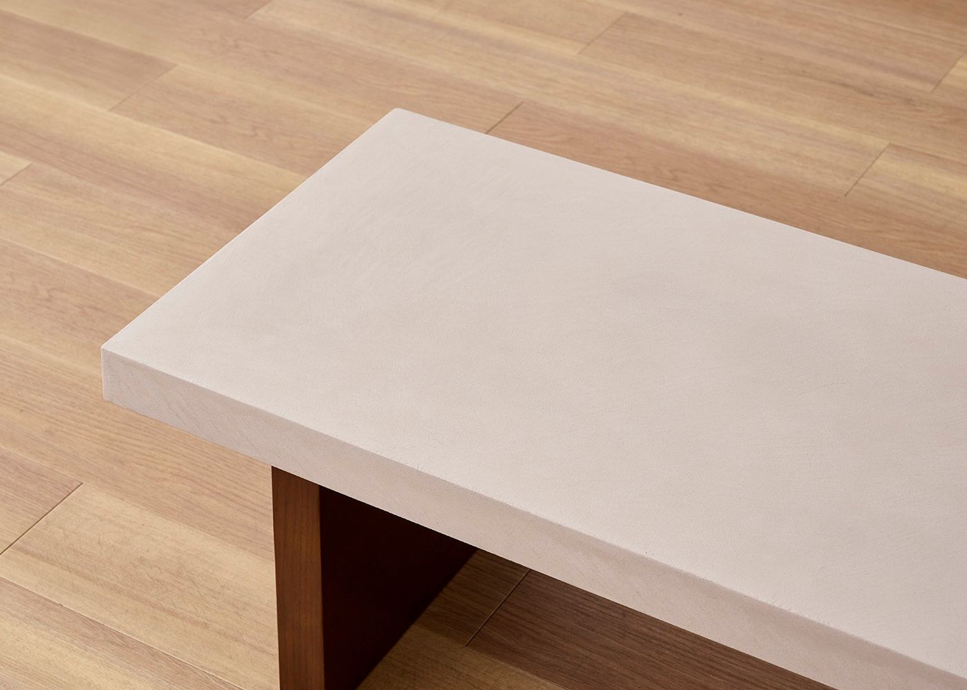 天板には、コンクリートのような表情をもったモールテックス天板を採用。コンクリートでよく見られる、ひび割れや表面の削れが発生しにくい高い強度と撥水性があり、シミのリスクが低いのが特長です。また、天板に凹凸はほとんどなく書き物もできるため、耐久性や利便性、デザイン性を兼ね備えたテーブルです。