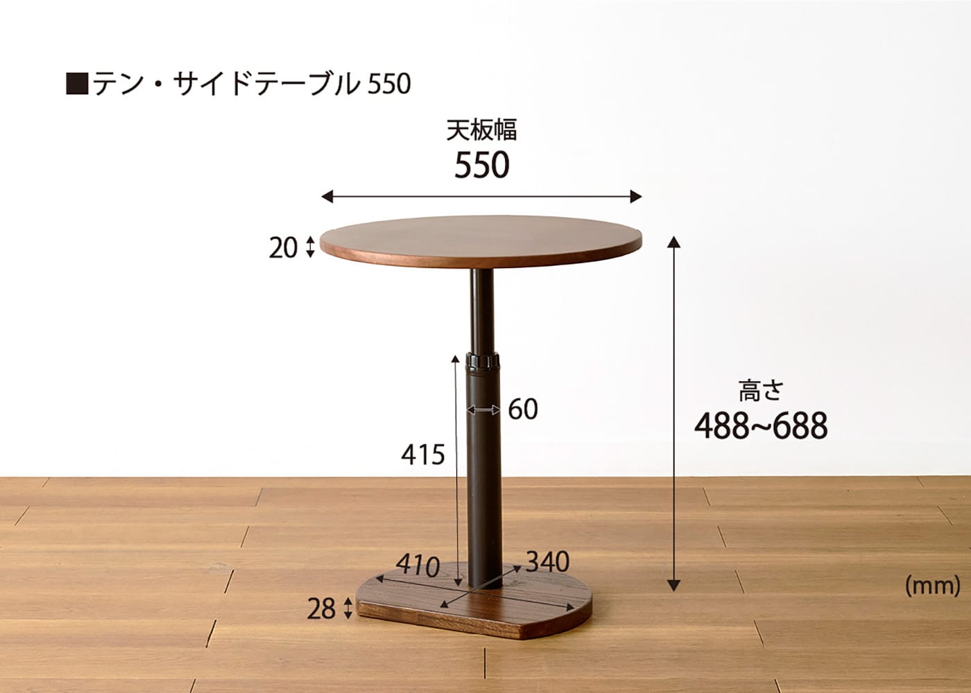 テン・サイドテーブルを置いた場合のイメージ。550よりも一回り小さく設計されているので、お部屋の広さや用途に合わせて、好みのサイズをお選びください。(写真は天板直径410mmのテン・サイドテーブル)